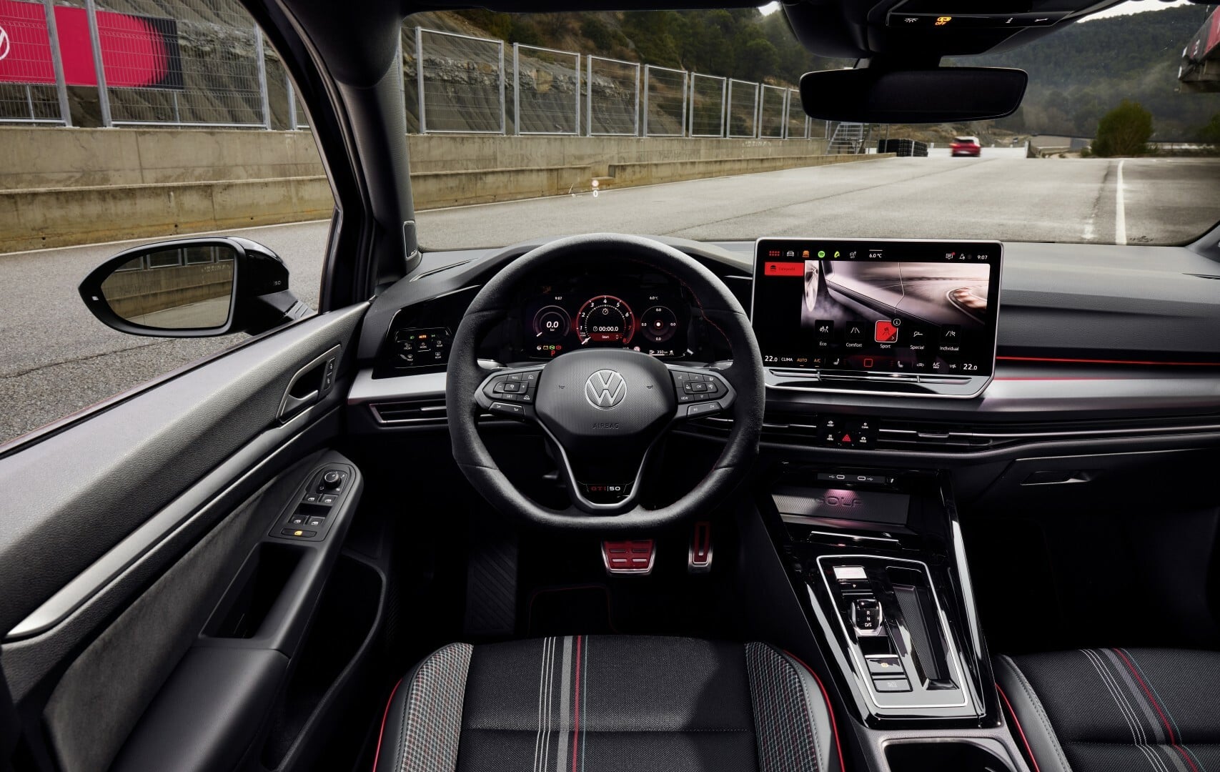 Στο εσωτερικό, τα σπορ καθίσματα με ειδικό σχέδιο Clark GTI 50, οι κόκκινες λεπτομέρειες και οι επιμέρους επετειακές αναφορές, τονίζουν τον ξεχωριστό χαρακτήρα του μοντέλου.
