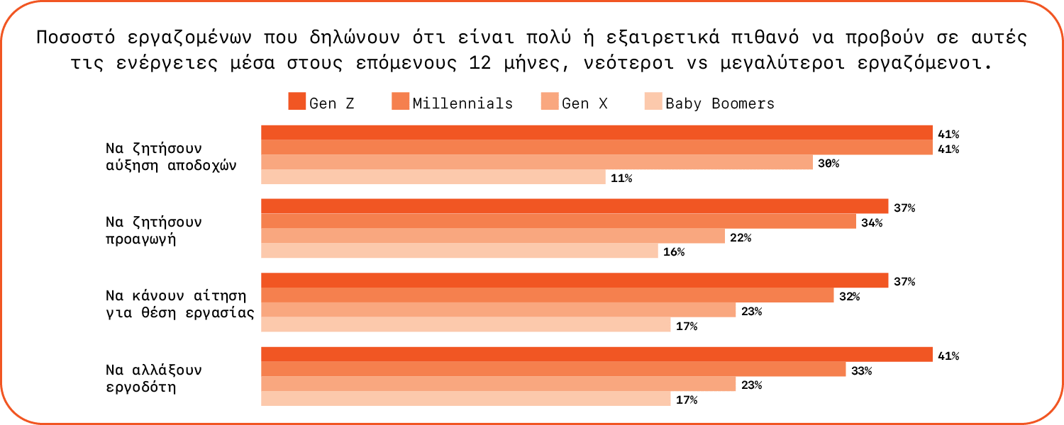 Αντίστοιχα, μόνο το 11% δηλώνει ότι υπέβαλε αίτηση για νέα δουλειά, ποσοστό χαμηλότερο από το 15% που καταγράφεται παγκοσμίως. Την ίδια στιγμή, το 10% αναφέρει ότι άλλαξε εργοδότη τον τελευταίο χρόνο, σε σύγκριση με το 9% παγκοσμίως. Τα στοιχεία αυτά συνθέτουν την εικόνα μιας αγοράς που χαρακτηρίζεται από περιορισμένες ευκαιρίες και συγκριτικά χαμηλή κινητικότητα.