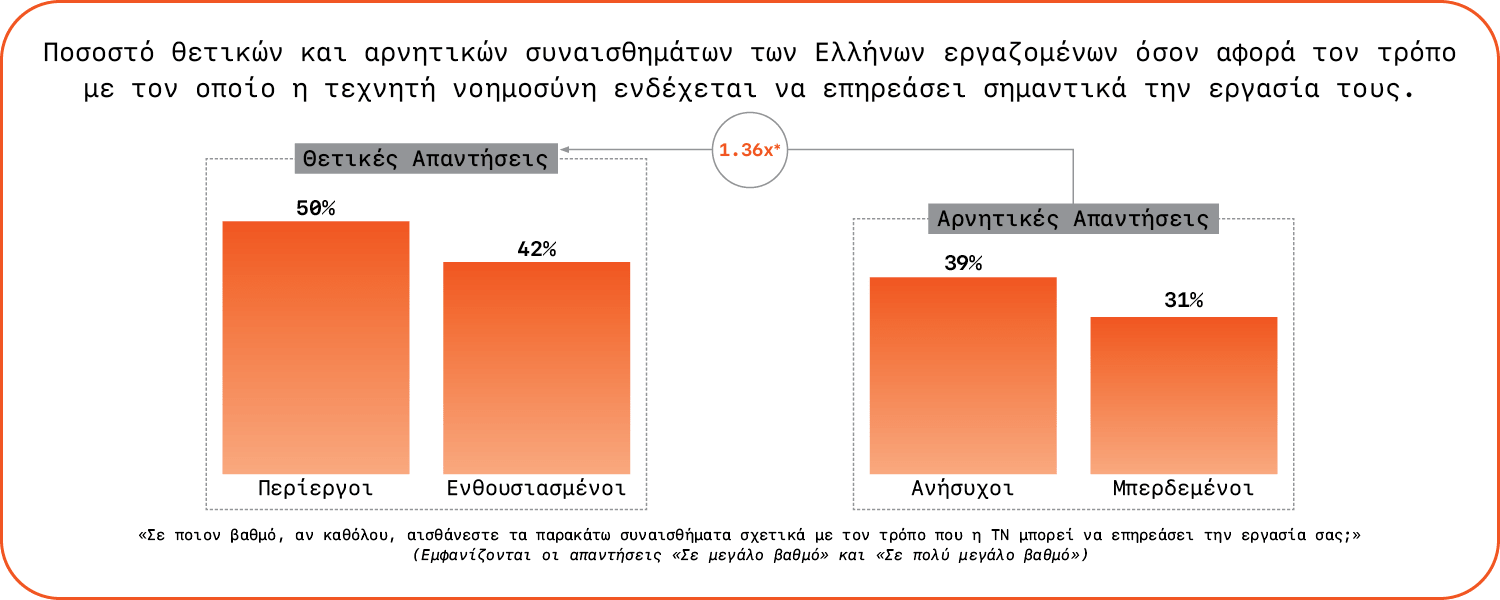Στην Ελλάδα, οι εργαζόμενοι είναι περίπου 1,5 φορά πιο πιθανό να δηλώνουν θετικά παρά αρνητικά συναισθήματα για τον αντίκτυπο της ΤΝ στη δουλειά τους, στοιχείο που δείχνει ότι η τεχνητή νοημοσύνη αντιμετωπίζεται περισσότερο ως ευκαιρία παρά ως απειλή.