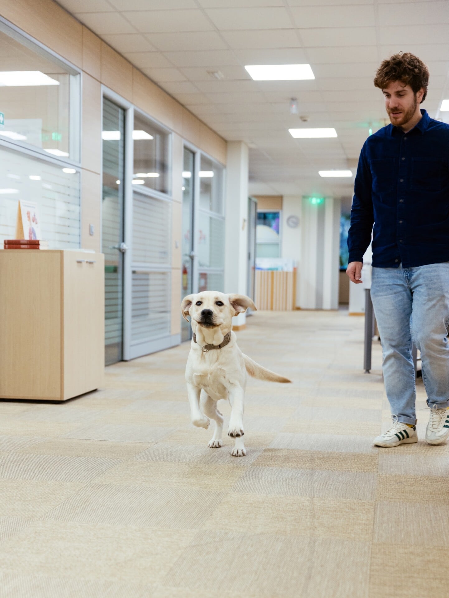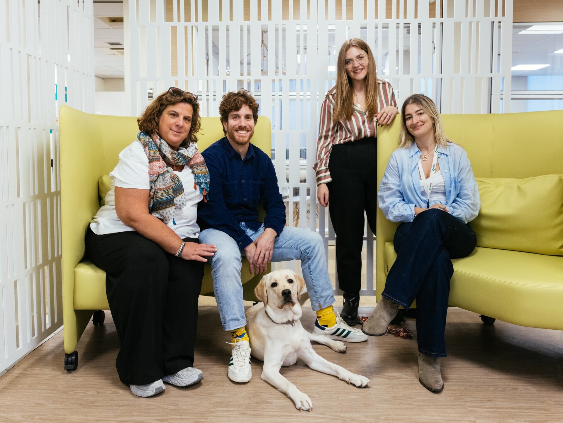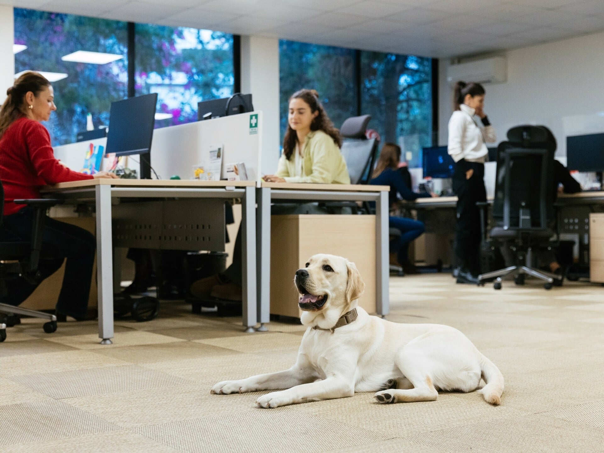 Οι εργαζόμενοι της χαμογελούν, σηκώνονται να τη χαϊδέψουν, να παίξουν λίγο μαζί της. Όταν κάθεται για λίγο στη μέση ενός γεμάτου τμήματος με γραφεία, κάποιοι τη βγάζουν φωτογραφίες με το κινητό. «Είναι η μασκότ μας!», λέει η Εύα. «Η πιο συχνή ερώτηση που μας κάνουν οι υπόλοιποι εδώ είναι “τι θα κάνουμε όταν φύγει;!”».