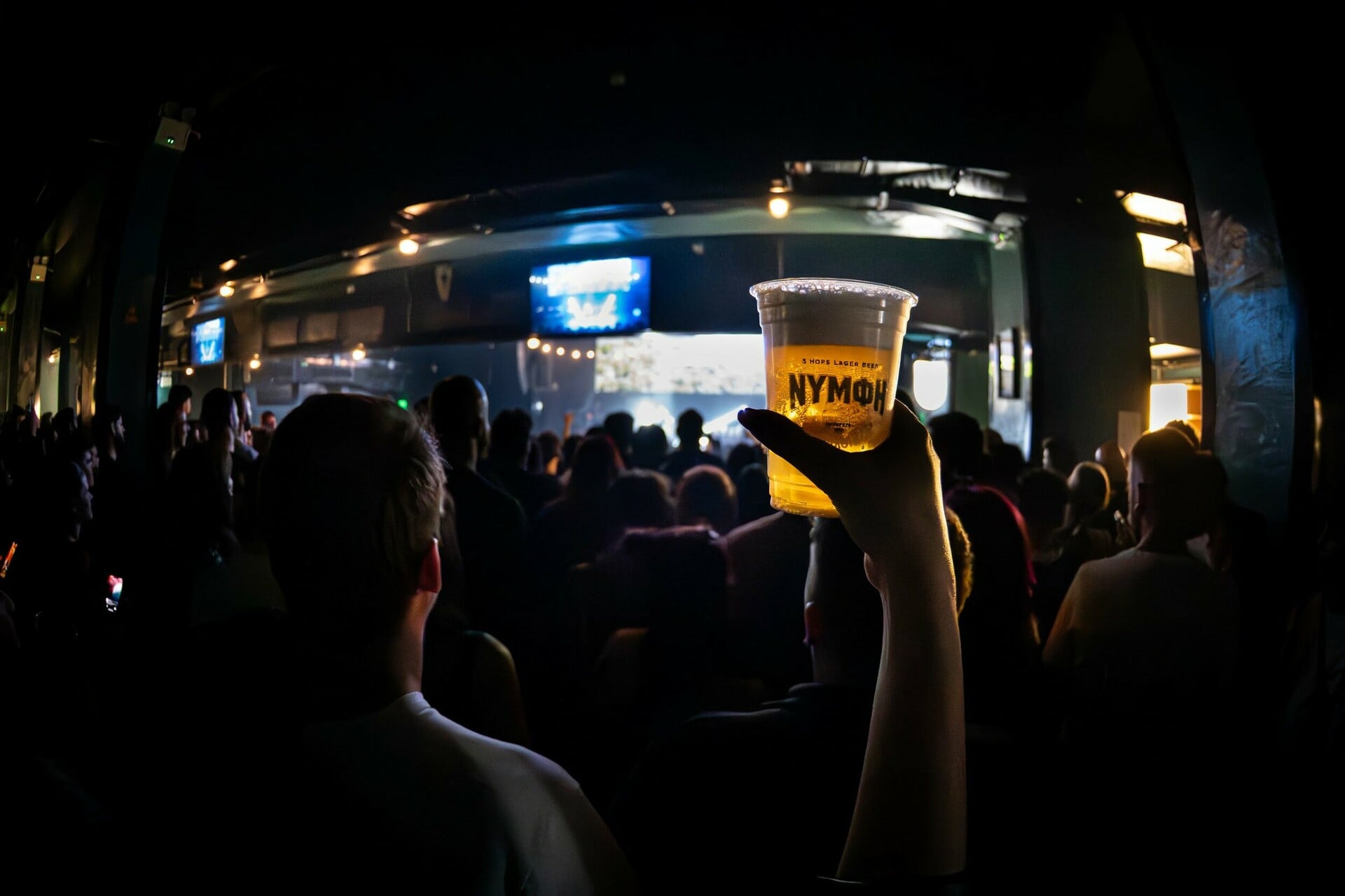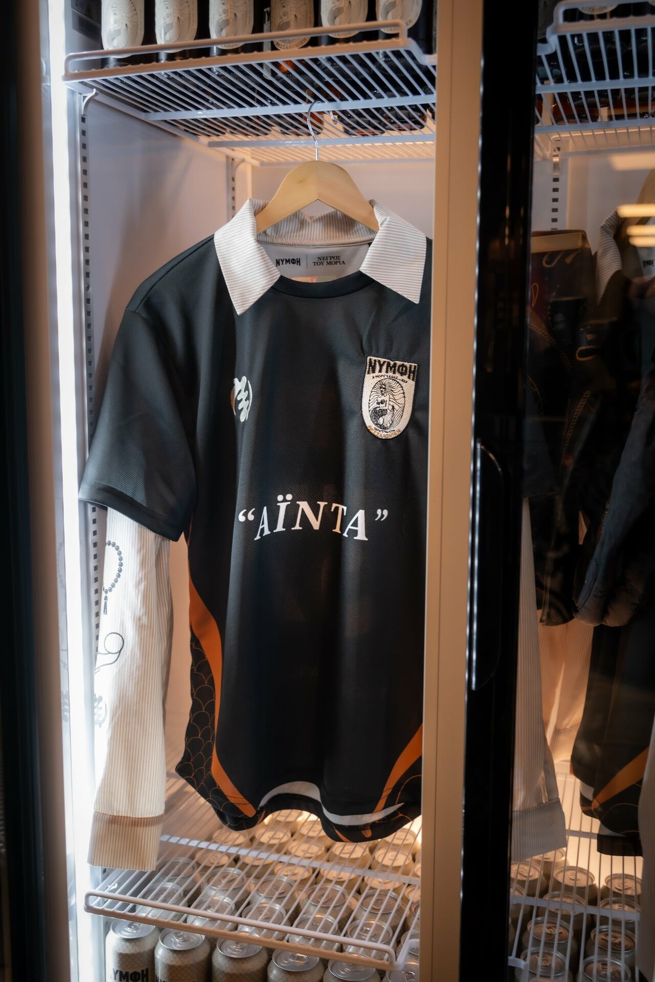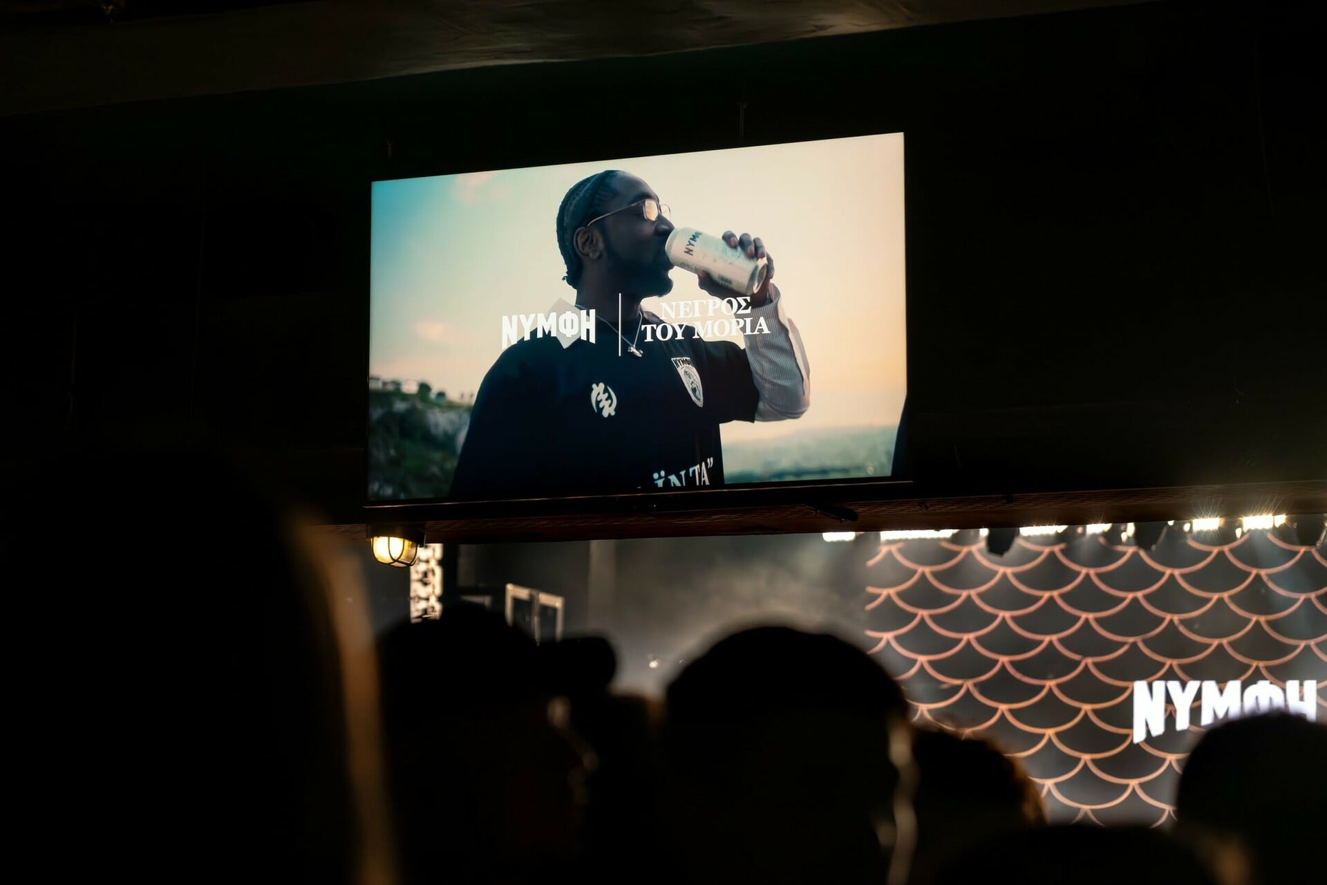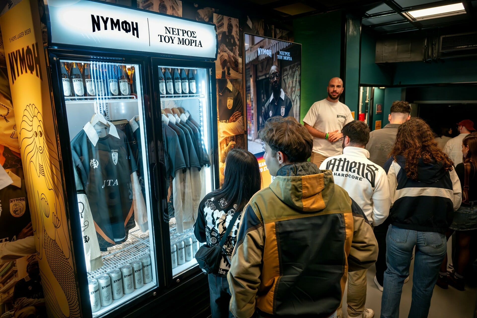 Μπαίνοντας στον χώρο, η ατμόσφαιρα ήταν cool, γεμάτη ενέργεια. Άνθρωποι κάθε ηλικίας, πρόσωπα γεμάτα προσμονή και ένας χώρος που γέμισε αμέσως. Κατευθείαν, το μάτι μας έπεσε στο ειδικά διαμορφωμένο corner της Νύμφης με το πρωτότυπο display-ψυγείο Νύμφη και τη merch συλλογή με τον Νέγρο του Μοριά. Εννοείται πως το πρώτο πράγμα που κάναμε ήταν να σκανάρουμε το QR code, για να μπούμε στον διαγωνισμό που «έτρεχε» καθ' όλη τη διάρκεια του live και να κερδίσουμε το συλλεκτικό jersey.