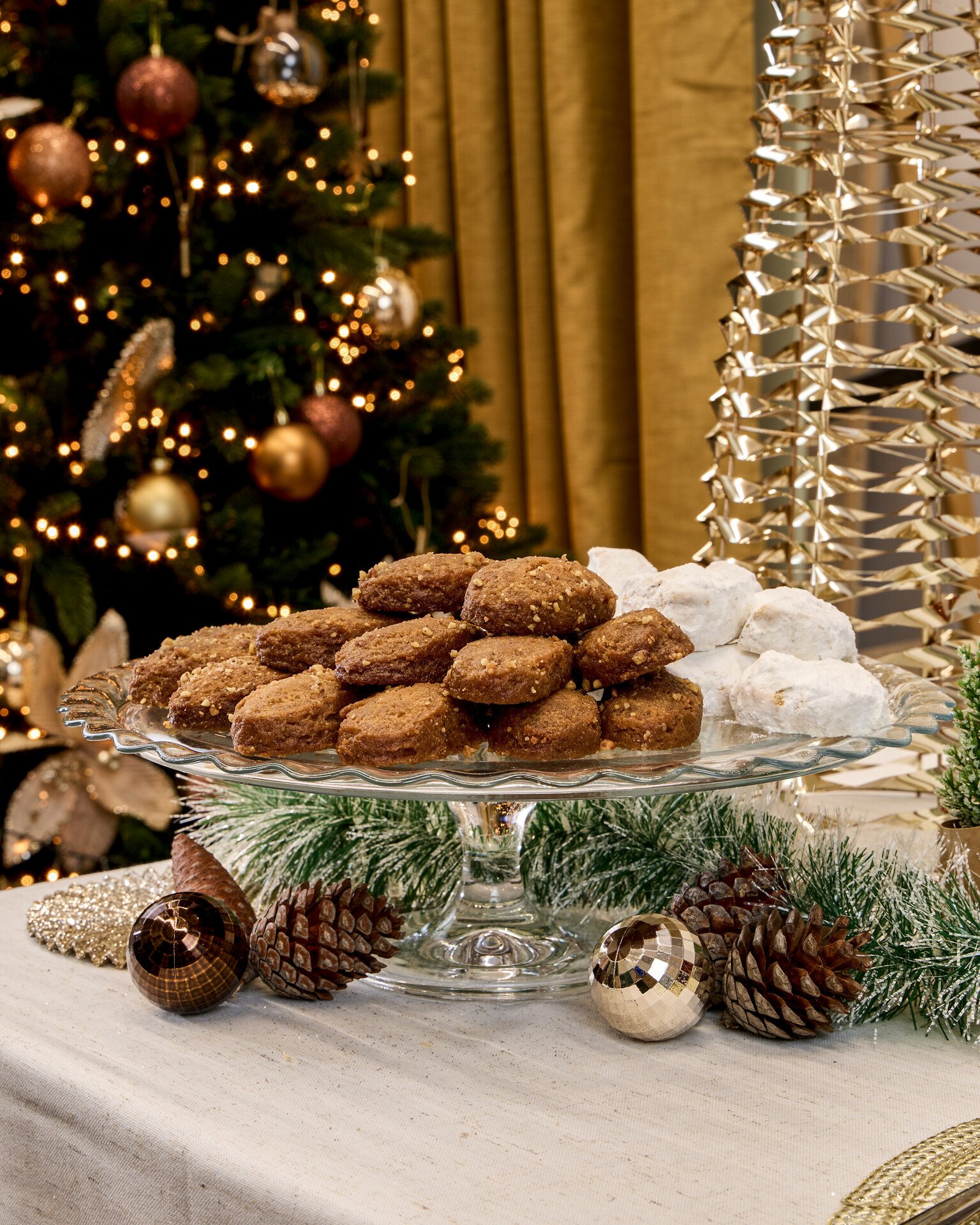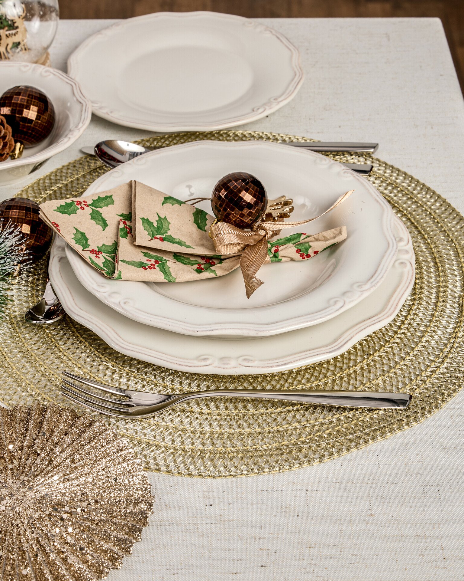 Από την άλλη, μπορείς να προτιμήσεις ένα soft Golden look με λευκά κεριά, σουπλά στο χρώμα της σαμπάνιας, διακοσμητικές χιονόμπαλες και έναν λευκό Καρυοθραύστη στολίδι, κομψά λευκά πιάτα και χρωματιστές χαρτοπετσέτες. Έτσι θα έχεις festive vibes, αλλά με μία πιο ήπια χρωματική παλέτα.