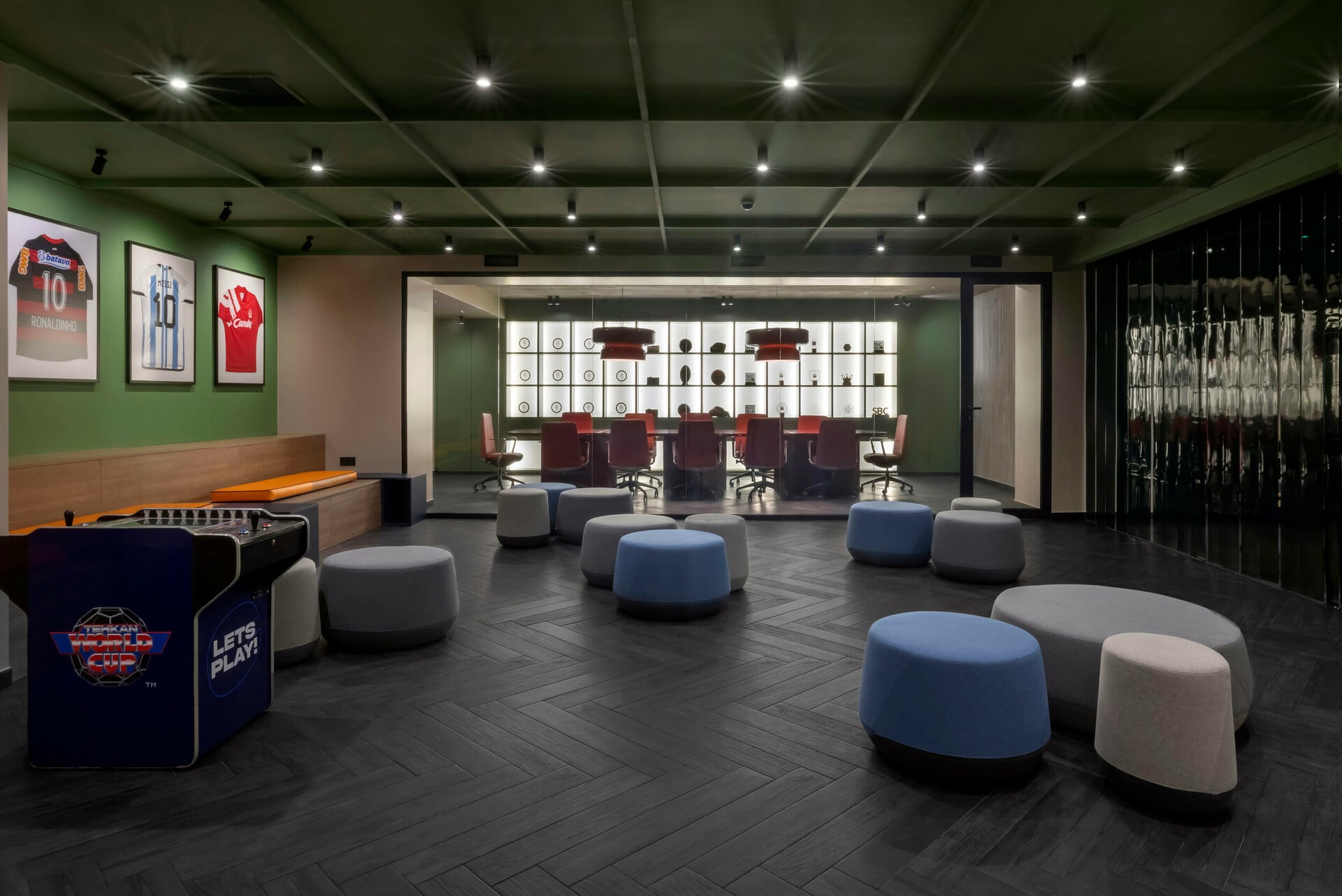 Η απόφαση για τον ρόλο κάθε ορόφου πηγάζει από την ανάγκη της Campeón Gaming να ισορροπήσει μεταξύ της επαγγελματικής αποτελεσματικότητας και της κοινωνικής σύνδεσης. Στο Ισόγειο, δημιουργήσαμε έναν χώρο υποδοχής και συνεργασίας που λειτουργεί ως η «πρώτη εικόνα» της εταιρείας. Διαθέτει 35 θέσεις εργασίας σε open-plan διάταξη, meeting rooms και lounge επισκεπτών, ενθαρρύνοντας την άμεση αλληλεπίδραση και την εξωστρέφεια από την πρώτη στιγμή που εισέρχεται κανείς στο κτίριο.