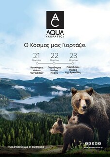 Πολλές φορές αρκεί «ένα θαύμα της παρθένας φύσης» για να γεννήσει μια υπέροχη ιστορία, αλλά και μια απλή αφορμή. Στην περίπτωση του AQUA Carpatica η αφορμή είναι τριπλή και συνδετικός κρίκος όλων το νερό. Η απόλυτη πηγη ζωής. Το φετινό τριήμερο 21-23 Μαρτίου, είναι ευκαιρία για ευαισθητοποίηση σε τρεις ξεχωριστούς τομείς της ζωής με φόντο τις Παγκόσμιες Ημέρες τους. Εκείνες των δασών (21/3), των νερών (22/3) αλλά και των αρκούδων (23/3).