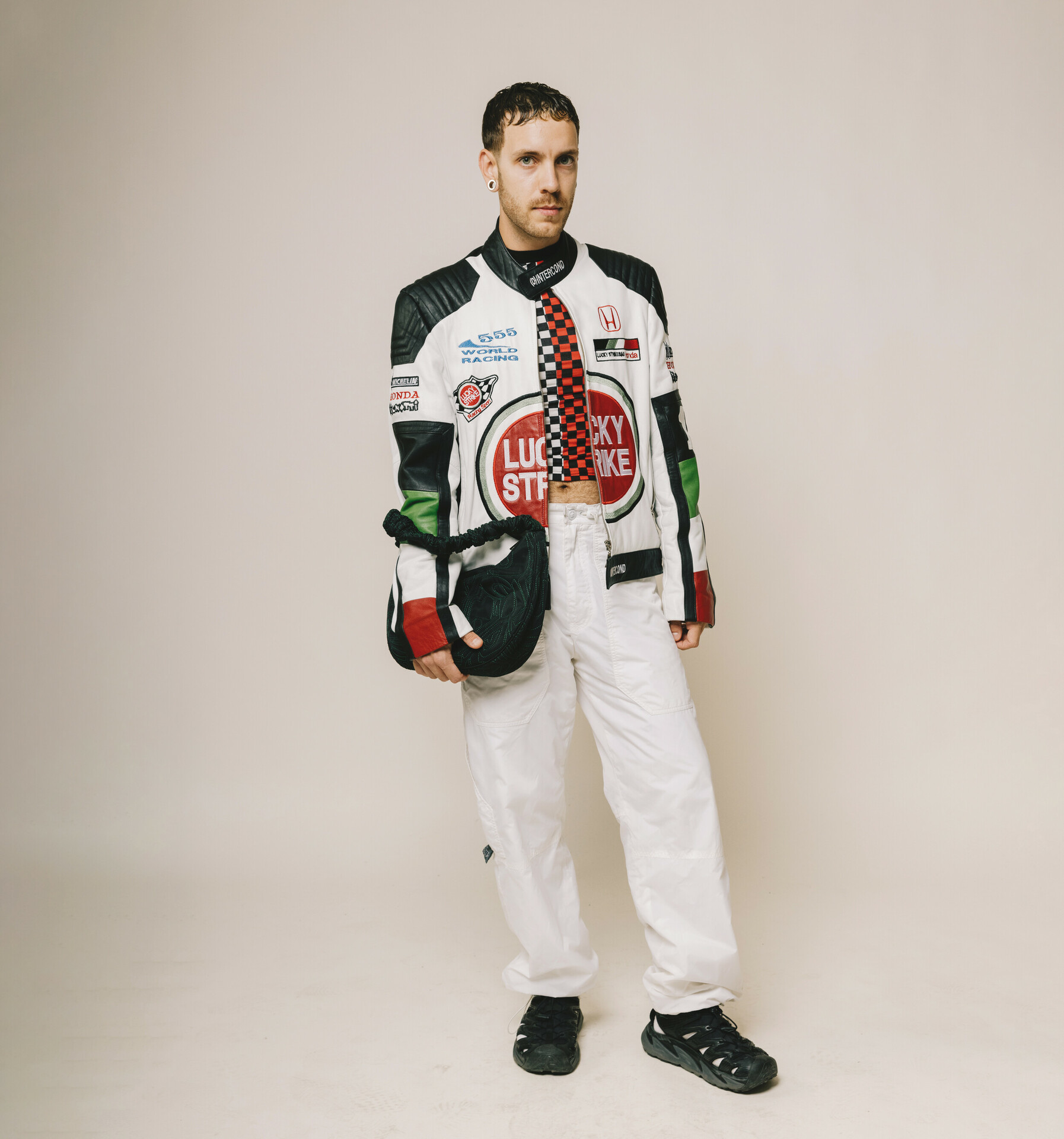 Φοράω ένα thrifted biker jacket (€30) καθώς και ένα Ckeckerboard top (€4), το οποίο αγόρασα επίσης second hand, και ένα cargo παντελόνι από την Killah Babe (€50). Η τσάντα μου είναι HVISK (€80) και τα παπούτσια HOKA (€110).