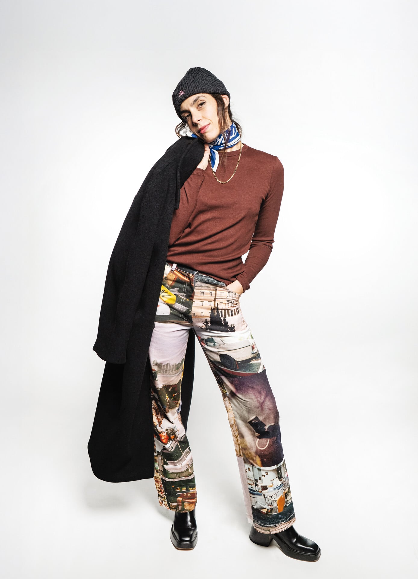 Το beanie είναι Maison Antisht (€35), το μαντίλι Aime Leon Dore (€45), το μπλουζάκι Uniqlo (€20), το παντελόνι Anamnesi (€155), τα παπούτσια Maje (€400), το παλτό COS (€300), το τσαντάκι Arket (€19). Η αλυσίδα και τα σκουλαρίκια είναι χρυσά βίντατζ από τη γιαγιά μου και τη θεία μου αντίστοιχα, το eye ring κόστισε €165 και το κεραμικό δαχτυλίδι είναι από SOMA και κόστισε €80.