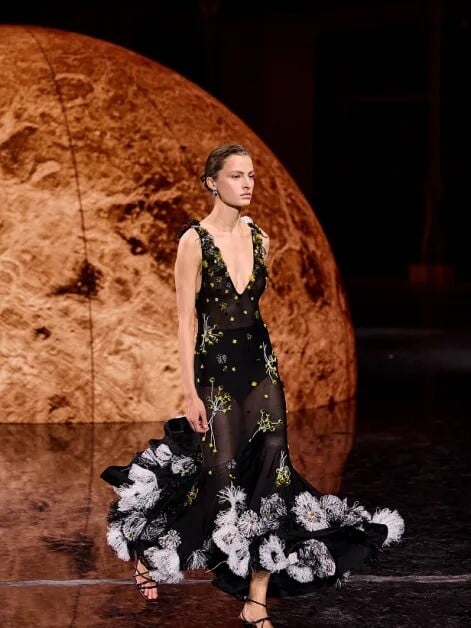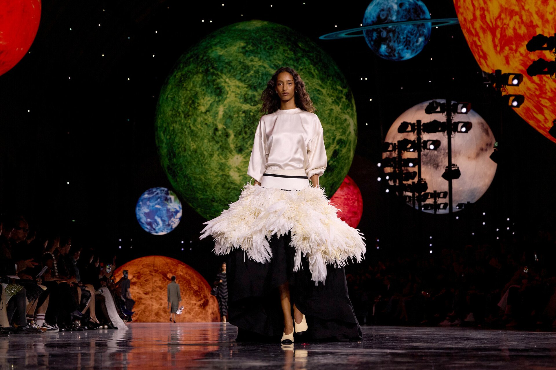 Η επίδειξη της Chanel για την άνοιξη του 2026, σε ένα ανακαινισμένο Grand Palais που είχε μετατραπεί σε γαλαξία, με γιγάντιους χρωματιστούς πλανήτες να αντανακλώνται στο μαύρο γυαλιστερό πάτωμα, σχεδιάστηκε φαντασμαγορικά (στην παράδοση των μνημειωδών σόου του Karl Lagerfeld), απέπνεε, όμως, μια αναπάντεχη οικειότητα και μια ήσυχη δύναμη.