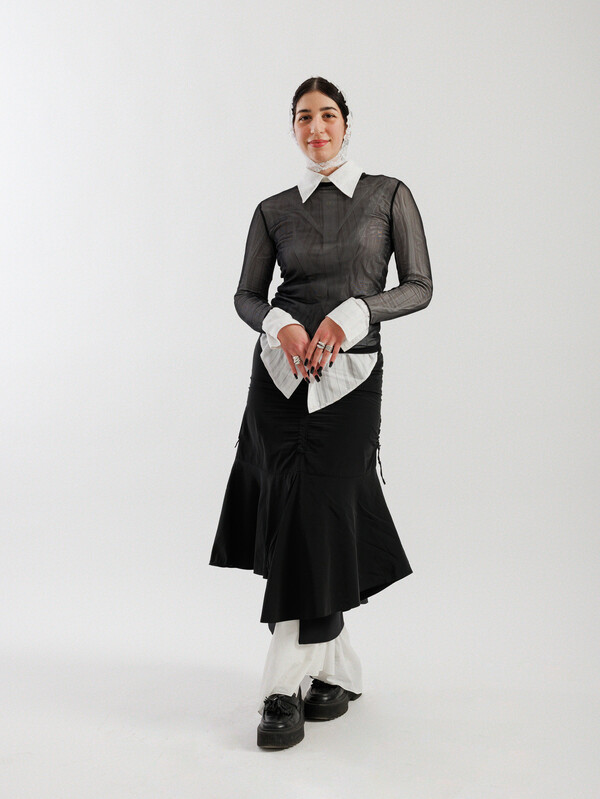 Φοράω μια μπαλακλάβα που έχω φτιάξει η ίδια, ένα πουκάμισο αρκετά παλιό –δεν θυμάμαι το brand και την τιμή του–, μια διαφάνεια από Stradivarius (το οποίο έχω πολλά χρόνια, οπότε δεν θυμάμαι την τιμή του), μια ασύμμετρη φούστα thrift 5 ευρώ, από κάτω μια pencil της μαμάς μου, και κάτω απ’ όλα αυτά ένα φόρεμα λευκό που επίσης έχω πολλά χρόνια και δεν θυμάμαι πόσο είχε. Τα παπούτσια είναι loafers από ASOS και αν θυμάμαι καλά κόστισαν περίπου 20 ευρώ.