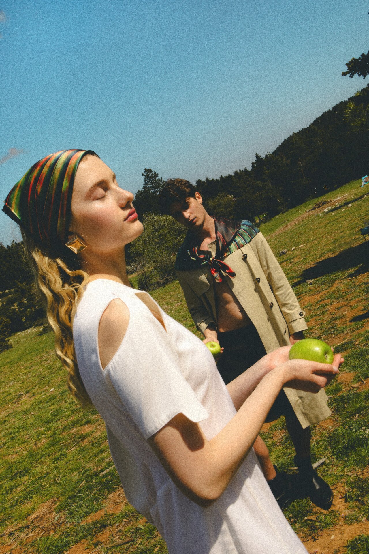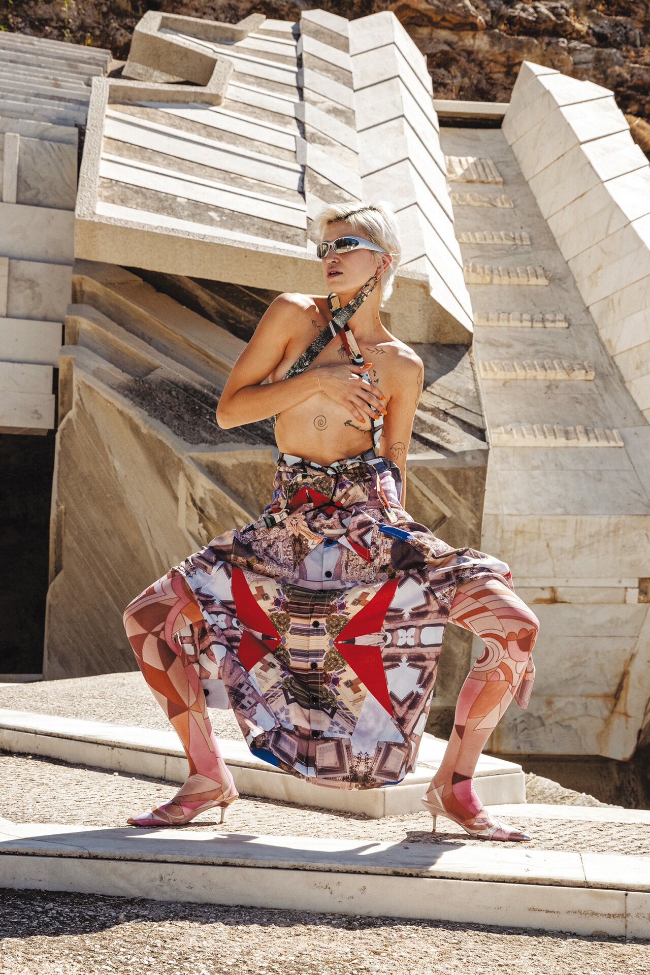 Αυτή η διαδικασία μπορεί να διαρκέσει έως και δέκα μέρες, μέχρι το pattern να βγει άψογο, με χρώματα πεντακάθαρα και vibe πιστό στην αρχική έμπνευση που δεν είναι άλλη από την Αθήνα, με την αλητεία και την ενέργειά της. Χαρακτηριστικό παράδειγμα, το ντεσέν The SOMF/Athens Times, μια εφημερίδα δικής της σύλληψης που λειτουργεί σαν ωδή στο newsprint του Galliano και περιέχει «συμβουλές» για αθηναϊκές μαζώξεις, τελετές ομορφιάς και τρόπους manifesting στην πόλη.