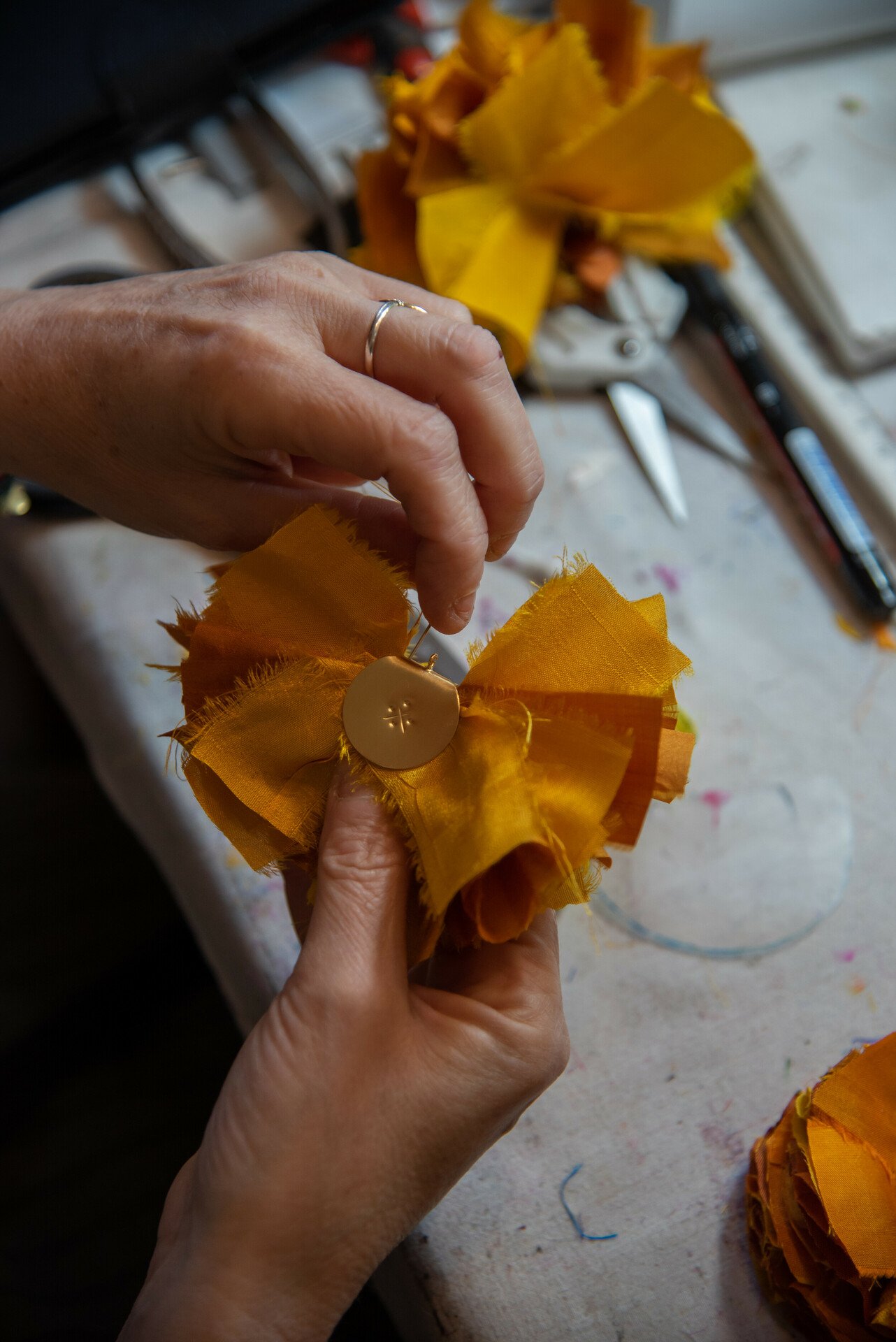 «Το πρώτο πράγμα που σκέφτομαι όμως είναι το σκουλαρίκι. Είμαι όντως κορίτσι του σκουλαρικιού, και με τα κολιέ ασχολήθηκα όταν ήθελα να κάνω ένα διάλειμμα». Κάποια στιγμή, ένα βιβλίο για τις πτυχώσεις στα αρχαιοελληνικά φορέματα της άνοιξε έναν ολόκληρο κόσμο. Έπειτα, όταν μαζί με τη μητέρα της βρήκαν στο χωριό μερικά κιλίμια κατεστραμμένα, βλέποντας τα ξέφτια τους σκέφτηκαν πως δεν γίνεται να τα πετάξουν, πως κάπως πρέπει να τα αξιοποιήσουν και έτσι προέκυψαν κάποια πρώτα κοσμήματα φτιαγμένα κλωστή- κλωστή. Τα σκουλαρίκια της Κατερίνας λοιπόν, εκείνα τα πλισέ, εύθραυστα μικρά γλυπτά από άγριο μετάξι και τα κομμάτια σαν βεντάλιες είναι η υπογραφή της. Αυτά τα κομμάτια επέλεξαν και ανέδειξαν οι buyers του Net-a-Porter, αυτά διάλεξε η Penelope Cruz να φιλοξενηθούν στο εξώφυλλο της ισπανικής Vogue, στο τεύχος που συμμετείχε ως guest editor, αυτά έχουν φωτογραφηθεί και από τον Mario Testino για τη βρετανική Vogue και έχουν φορεθεί από τη Sarah Paulson ενώ κάποια στιγμή άρχισαν να τα κοπιάρουν και μεγάλες fast fashion εταιρείες - και όταν σε μιμούνται, κάτι κάνεις καλά.