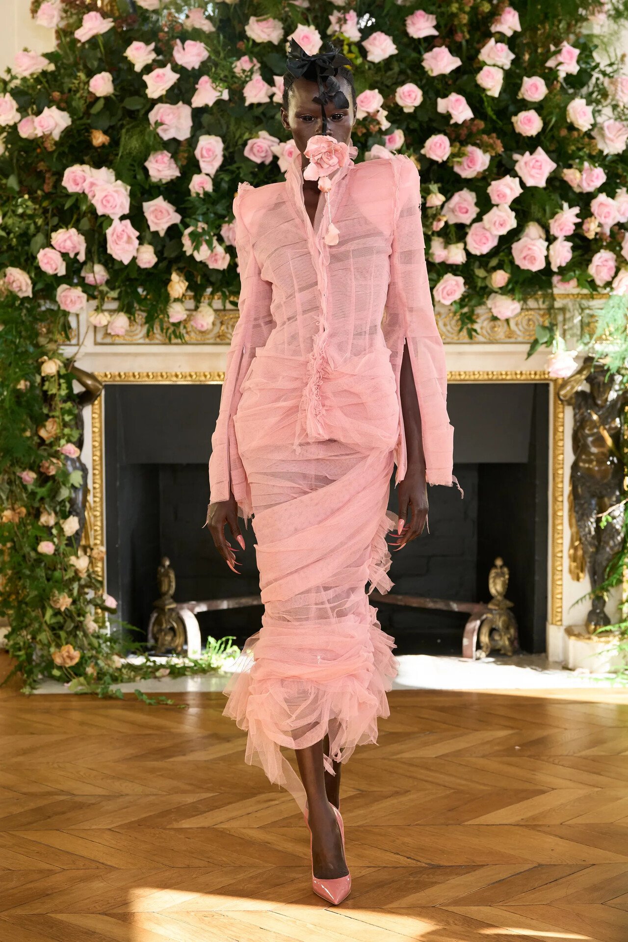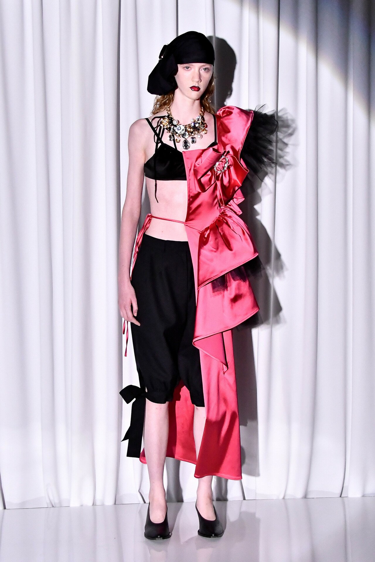 Φανταστείτε τη Vivienne Westwood να συναντά τη Madonna στη φάση του «Like a virgin» σε ένα πεδίο αμφισβήτησης και παιχνιδίσματος, που ιδανικά εκφράστηκε με την εμφάνιση της queer ράπερ Ashnikko: ένας αφρός από πτυχωτό ζαχαρένιο ροζ ύφασμα με ένα γιγαντιαίνο κορσάζ στον έναν ώμο.