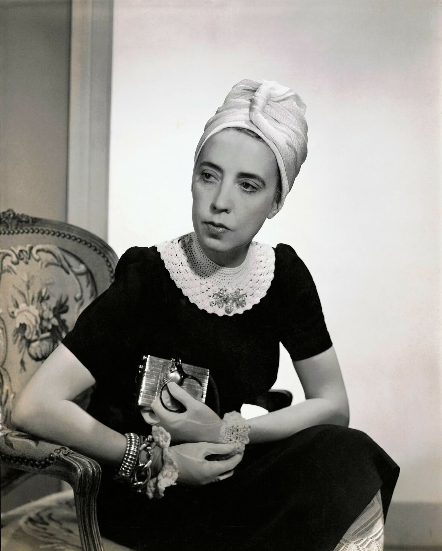 Η Έλσα Σιαπαρέλι ποζάρει για τη «Vogue» 1940. Φοράει μαύρο μεταξωτό φόρεμα με πλεκτό γιακά δικής της σχεδίασης και τουρμπάνι. Φωτ.: Fredrich Baker/Condé Nast