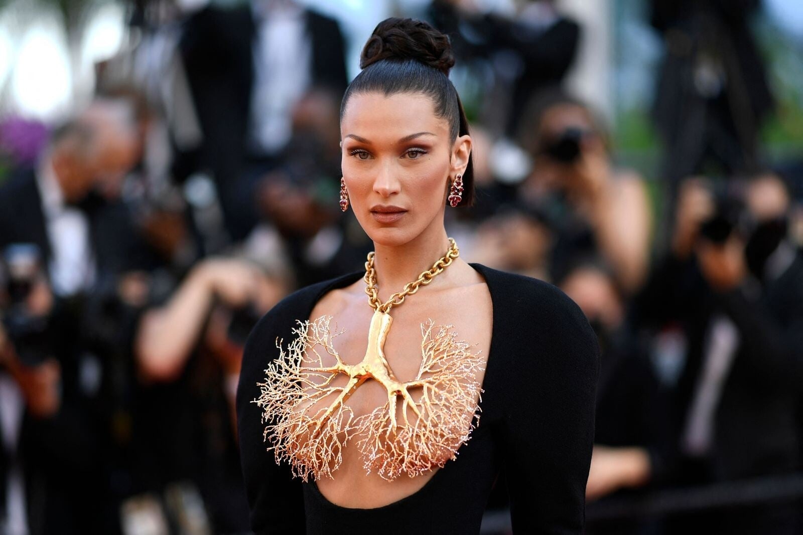 Η Μπέλα Χαντίντ με το βαρύ επιχρυσωμένο κολιέ που κατέληγε σε ένα δίκτυο πνευμονικών βρόγχων, το οποίο φόρεσε το 2021 στις Κάννες.
