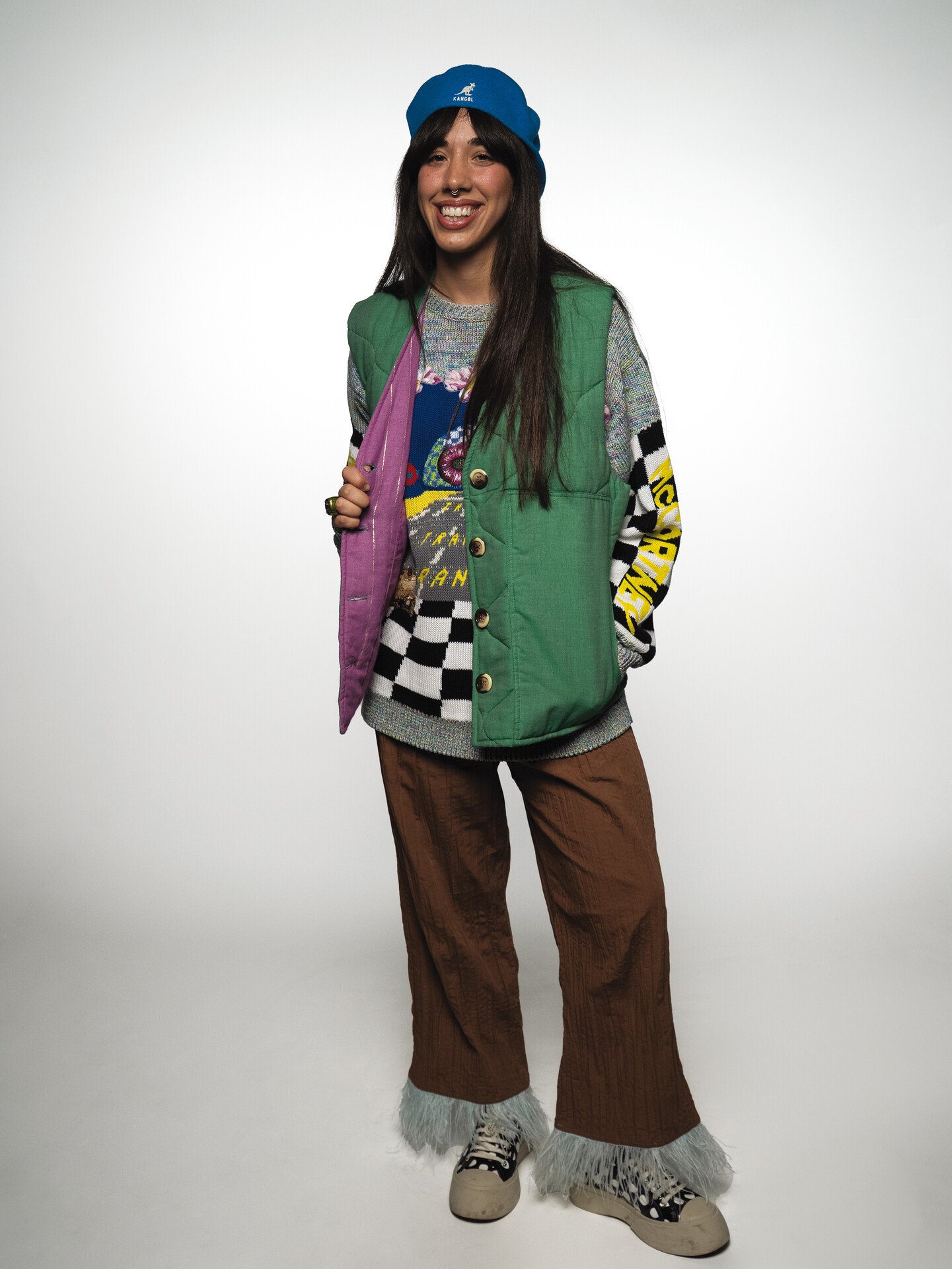 Ένα γιλέκο Ergon Official, που είναι δώρο, πουλόβερ Stella McCartney (€130), παντελόνι MilkWhite από archive sales (€30), τσάντα από την εταιρεία By Far (€70) και παπούτσια Marni (€100). Το καπέλο είναι Kangol και είναι βίντατζ (€20).