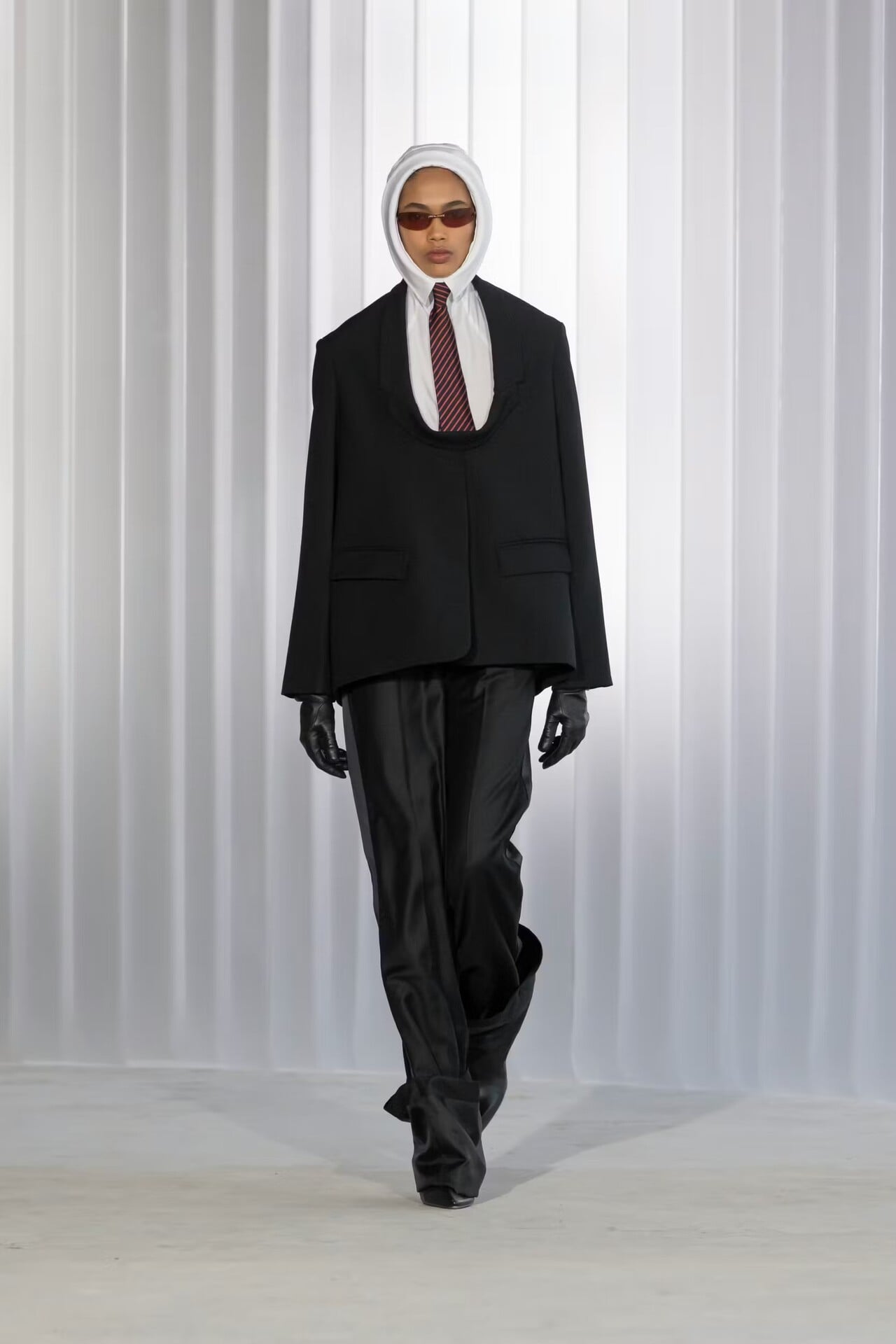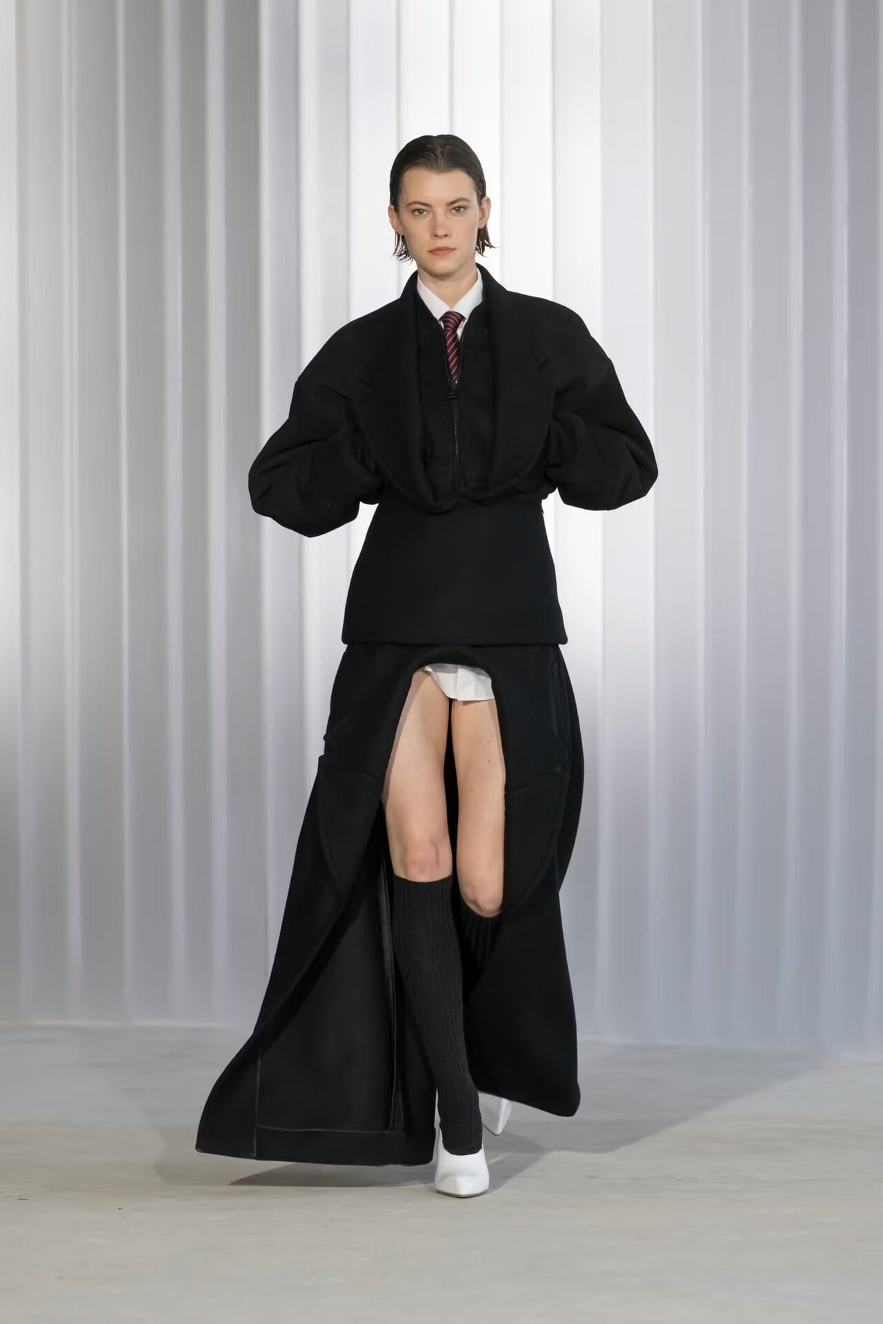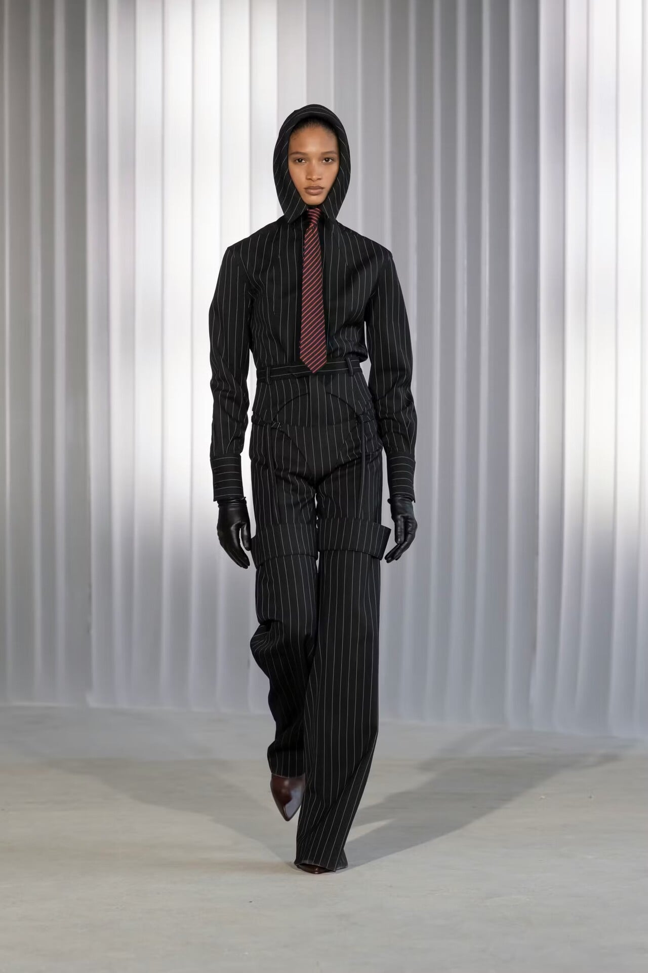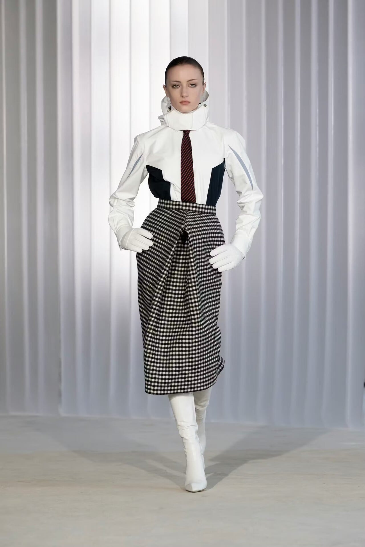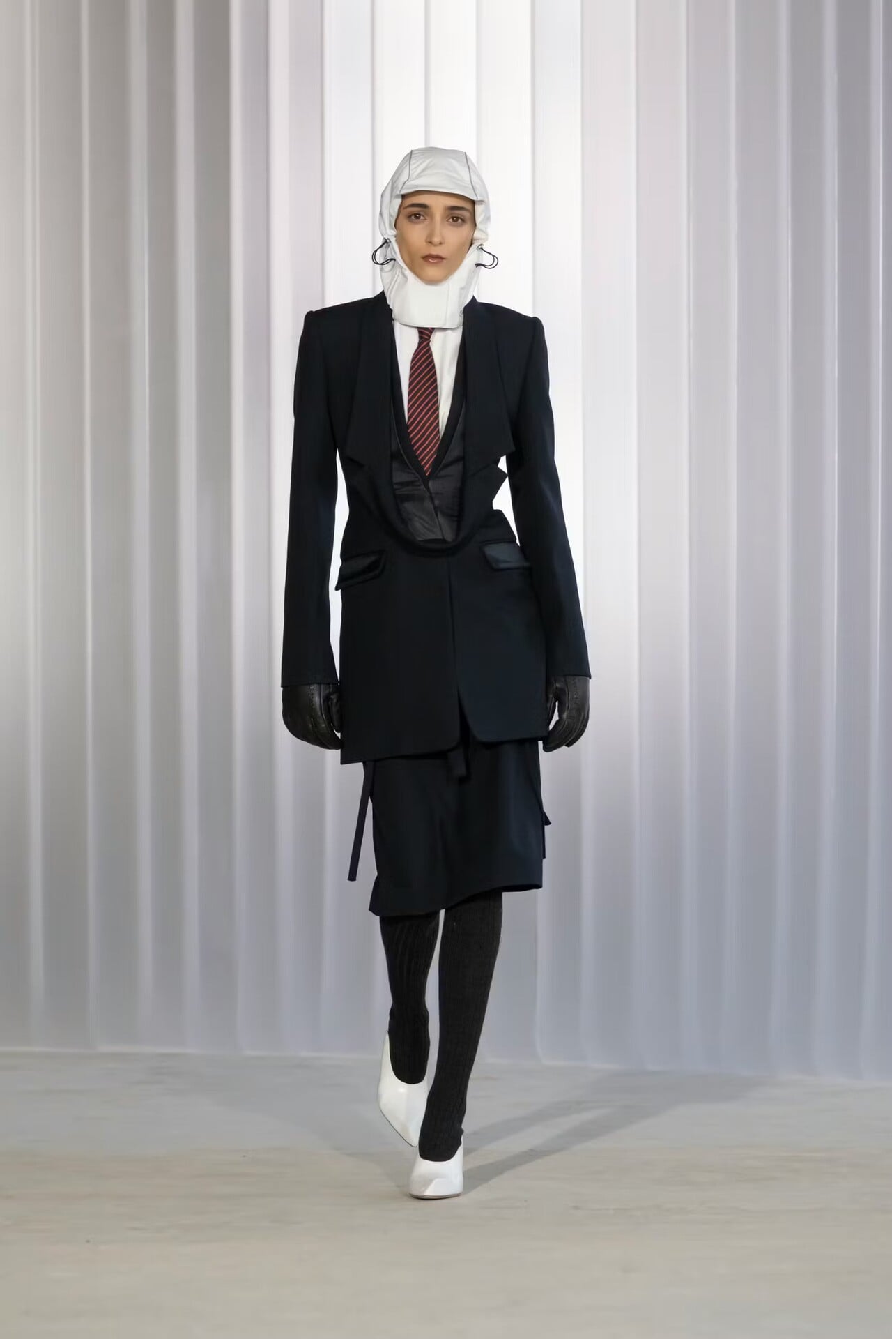 Ένα μακρύ ναυτικό σακάκι σχεδιάστηκε με αναποδογυρισμένο γιακά (ο λαιμός βρέθηκε στον αφαλό)… Ένα άλλο look «ζωγραφίστηκε» αποκλειστικά από διαφορετικά κομμάτια με ψιλές, κάθετες ρίγες που δημιουργούσαν την εντύπωση στολής (πουκάμισο, εξωτερικά φορεμένα εσώρουχα, αναβολείς ροντέο πάνω από το παντελόνι, γραβάτα). Σε μια άλλη εκδοχή, ένα κορμάκι-μπουφάν με τονισμένη μέση φορέθηκε πάνω από ένα pinstripe παντελόνι και μια πλισαρισμένη σατέν τάνγκα πάνω από μαύρο παντελόνι σμόκιν και μαύρο πουκάμισο. Μαύρα γουέστερν καπέλα στάθηκαν χαμηλά στα κεφάλια των κοριτσιών, με το γείσο ενός να κατεβαίνει προς την πλάτη του μοντέλου, ανοίγοντας σε ένα κομμάτι ύφασμα που σχημάτιζε γιλέκο. Σε άλλες περιπτώσεις, τα πουκάμισα ανέβαιναν σχηματίζοντας κουκούλα που κατέληγε σε γιακά γύρω από τα πρόσωπα των μοντέλων. Υπήρξαν και μεμονωμένες άσπρες αδιάβροχες κουκούλες με μικρό γείσο, σφιχτά δεμένες κάτω από το πιγούνι των μοντέλων, που συνόδευαν κλασικά σύνολα με μακριά μεσάτα σακάκια και στενές φούστες. Και άλλες φούστες, σαν κυματιστά πανό, σκίζονταν στα δύο ψηλά στον καβάλο, αφήνοντας από μέσα να φανεί το τελείωμα ενός λευκού πουκαμίσου.