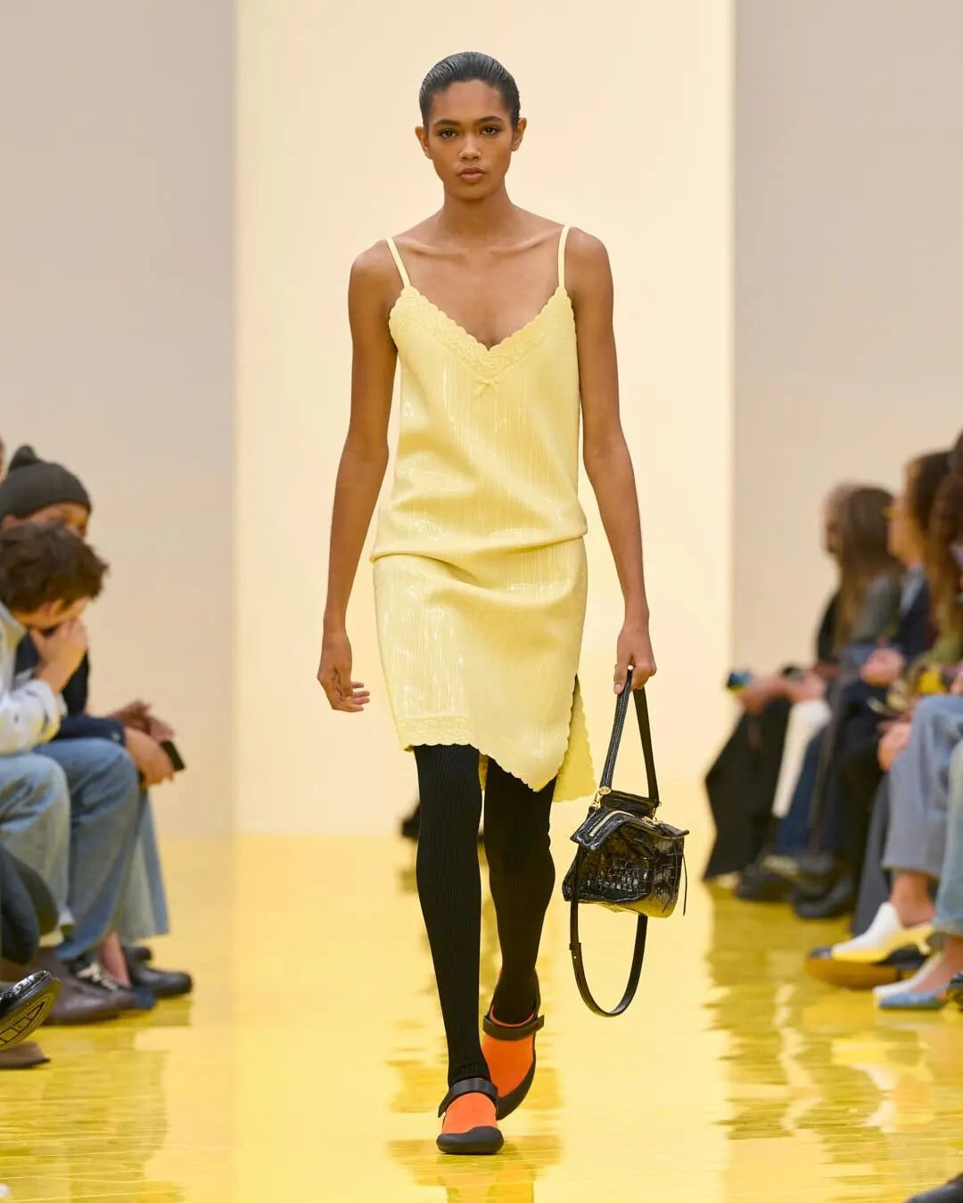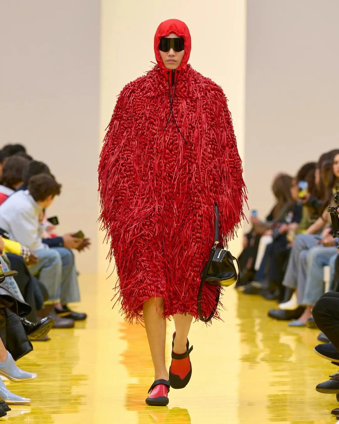 Parkas οχυρώθηκαν με διαστημικούς γιακάδες και κουκούλες, ενισχυμένα φουλάρια τεντώθηκαν σαν παραφουσκωμένοι ανεμοδείκτες, ενώ φαρδιά παλτό «πέταξαν» με προσθήκες καρό πάνελ στα πλαϊνά τους που έμοιαζαν με στρώματα θαλάσσης. Φορέματα-μισοφόρια από λάτεξ θα παρέπεμπαν σε εύθραυστα νεγκλιζέ αν δεν είχαν αυτήν τη γλιστερή επιφάνεια στολής κατάδυσης. Κομμάτια shearling σμιλεύτηκαν μέσα σε κοτλέ παντελόνια, καρό πουλόβερ και φουστάνια πλέχτηκαν από λεπτά δερμάτινα νήματα και μπουκλέ παλτό καλύφθηκαν από εκατοντάδες λακαρισμένες θηλιές που τους πρόσδιδαν όψη αχινού. Πλεκτά φορέματα με πετσετέ υφή αγκάλιασαν σφιχτά τα σώματα και σύρθηκαν στο έδαφος, ενώ άλλα φτιάχτηκαν από φτερά ή κορδόνια και συνδυάστηκαν με ζωηρόχρωμα οπάκ καλσόν.
