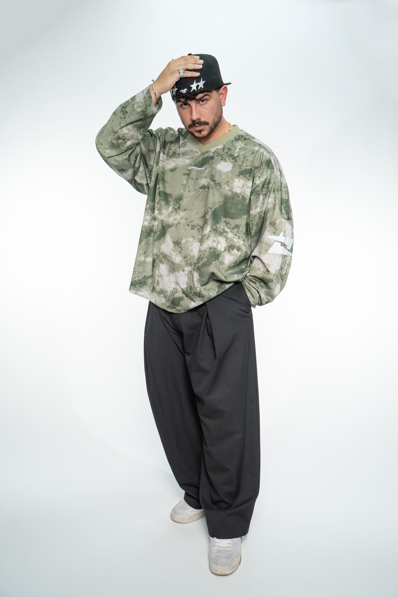 Το στυλ μου είναι άμεσα συνδεδεμένο με τη διάθεσή μου και το πώς θα ξυπνήσω το πρωί. Ίσως και με το τι έχω προλάβει να πλύνω. Θα έλεγα ότι έχει ως βάση το street style, χωρίς όμως να περιορίζεται εκεί. Μπορεί μια μέρα (βασικά τις περισσότερες) να επιλέξω oversized και baggy fits, και την επόμενη ένα κοστούμι – φυσικά σε έναν συνδυασμό κοστουμιού με καπέλο. Οι επιλογές μου, ακόμα και στα ρούχα, δεν ακολουθούν αυστηρούς κανόνες και σίγουρα δεν γίνονται διεκπεραιωτικά. Με ενδιαφέρει η αυθεντικότητα της κάθε στιγμής.