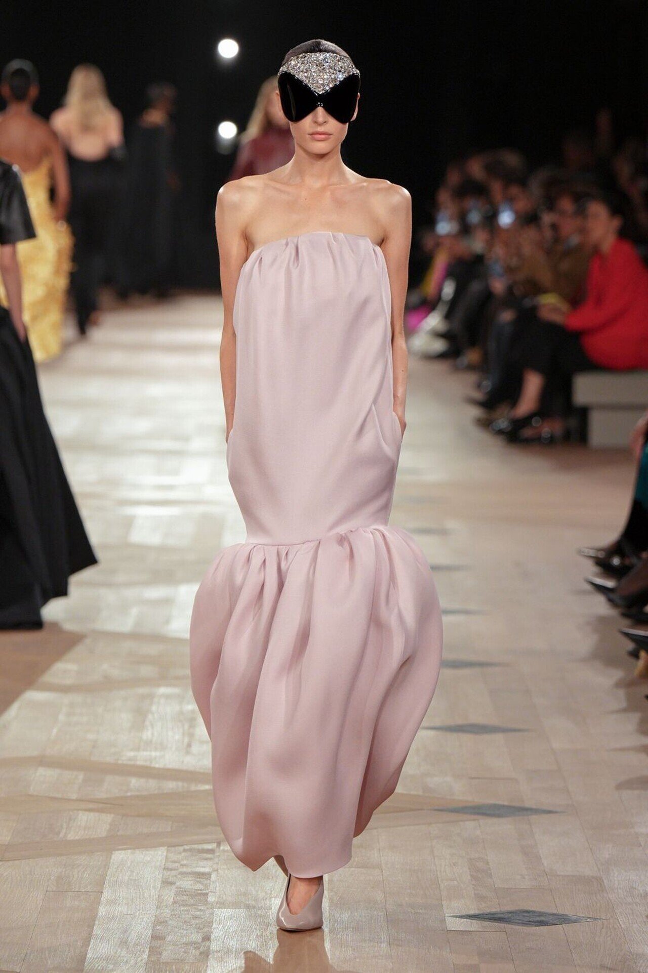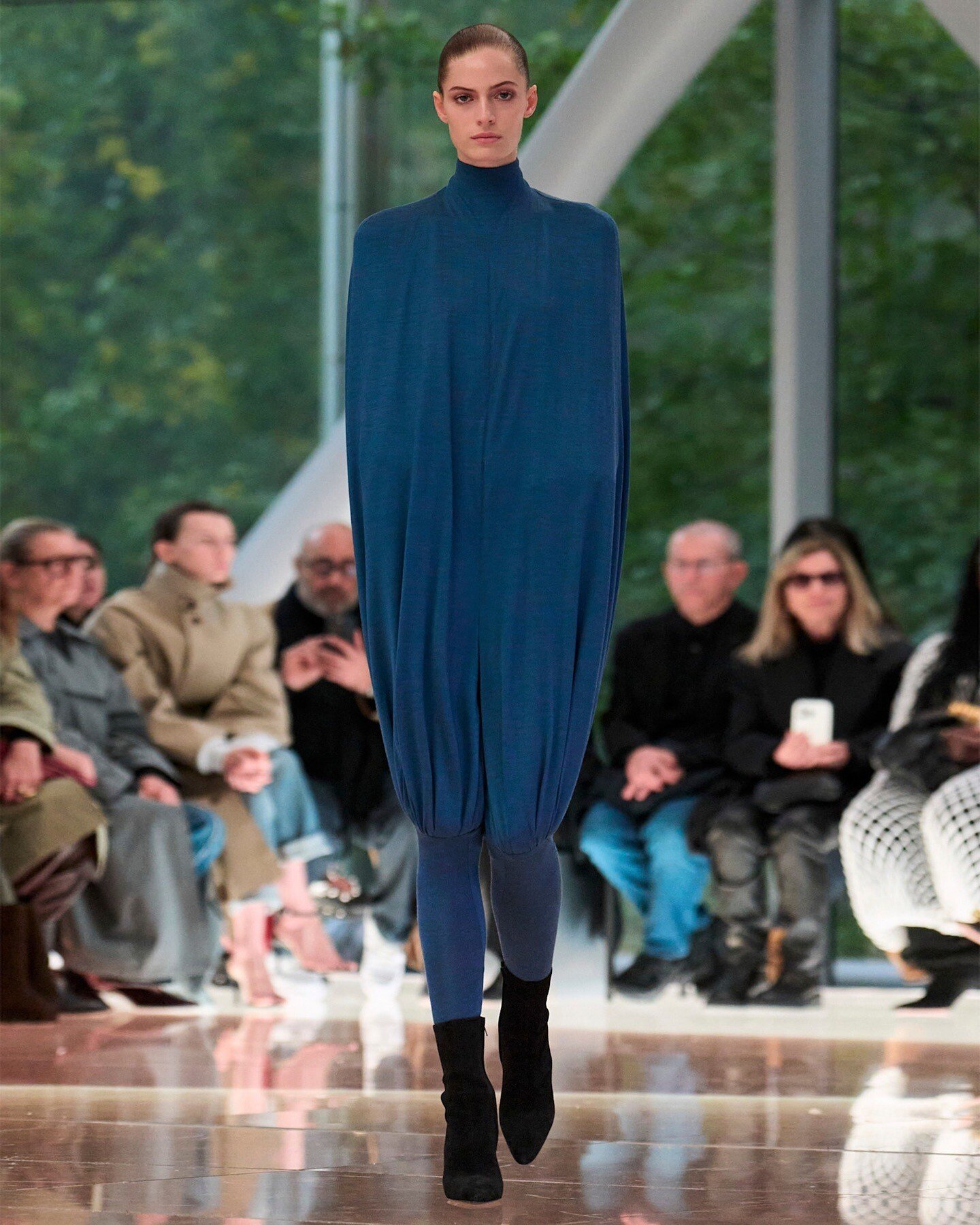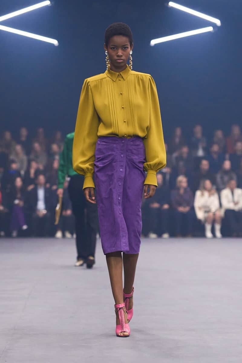 Ανάλογη ενόχληση προκάλεσαν και οι μακριές σκελέες στο –υπέροχο κατά τα άλλα– show του Pieter Mulier, νέου καλλιτεχνικού διευθυντή στον Alaia, που παρουσίασε ένα μονοκόμματο φόρεμα-φουφούλα, με τον κορμό και τα χέρια ακινητοποιημένα σε στυλ μούμιας. Τα μοντέλα έμοιαζαν παγιδευμένα και σίγουρα αδικημένα σε σχέση με τα άλλα κορίτσια του σόου, που φόρεσαν υπέροχες μπλούζες με ψηλό λαιμό σε στυλ τουνίκ, ασύμμετρες φούστες που κατέληγαν σε τεράστιες φούντες και χρωματιστά καλσόν που έφταναν ως τη μέση του μηρού απ' όπου ξεκινούσαν πυκνά κρόσσια.