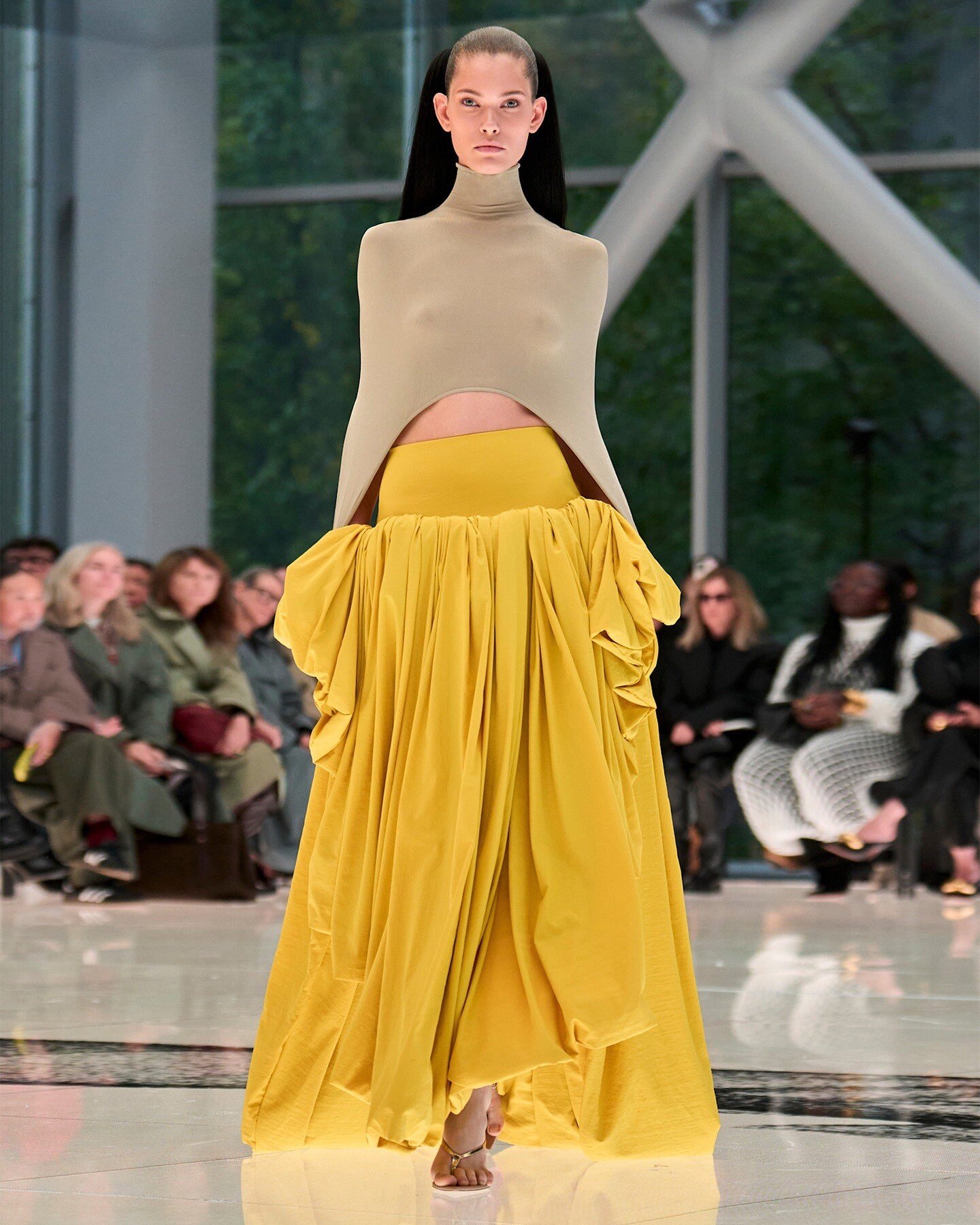 Και μετά, ήταν το θέμα της γύμνιας. Δεν μιλάμε για το naked dressing, που επικράτησε στον Tom Ford και τη Schiaparelli, ούτε για την περιοχή γύρω από τον αφαλό που «εκτέθηκε» στις περισσότερες συλλογές, από τον Hermès και τον Givenchy ως τον Rick Owens, καθώς τα tops αντικαταστάθηκαν από σουτιέν. Μιλάμε για γύμνια που κάνει βουτιά ως τα οστά της λεκάνης, όπως την είδαμε στον Alexander McQueen, όπου ο Seán McGirr αναβίωσε την camp αισθητική του Mugler με τα «bumster», low-rise κομμάτια που αφήνουν σε κοινή θέα και τα οπίσθια, ή για τα προκλητικά looks του Duran Lantink στον Gaultier, που λάνσαρε ξανά το τάνγκα και τα leotards (κορμάκι αεροβικής κατευθείαν από τα ’80s) με πολύ ψηλό κόψιμο στους μηρούς, ή ζωγράφισε πάνω σε ένα ζέρσεϊ ολόσωμο body (φορεμένο από γυναίκα) τις ανατομικές λεπτομέρειες του ανδρικού μορίου.
