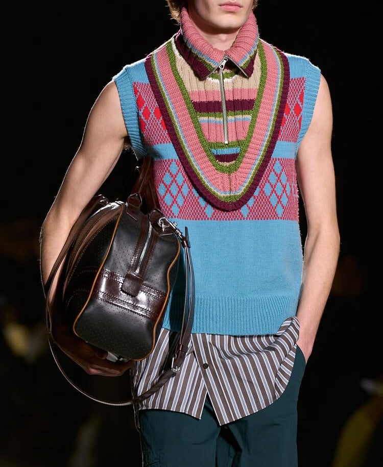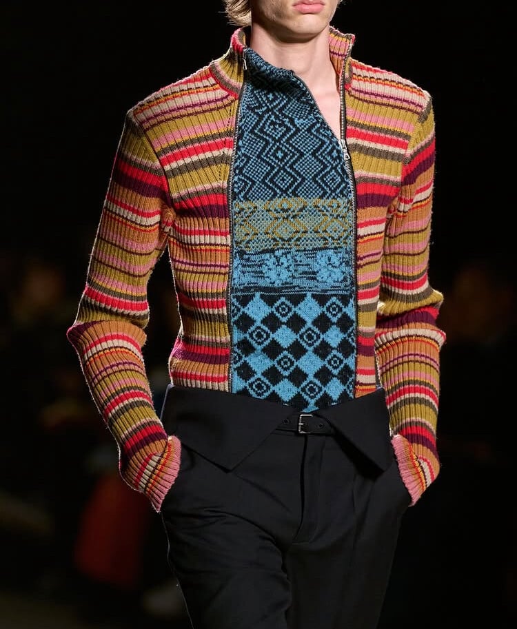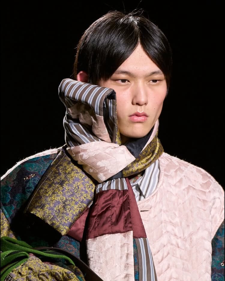 Ο τρόπος που συνδυάζει εμπριμέ και τυπώματα με αίσθηση ’80s ή ’70s μαζί με σχέδια που έχει ανασύρει από το αρχείο του oίκου πλάθει ένα λεξιλόγιο χωρίς ταίρι, με πολλαπλές στρώσεις, αρμονικό όσο και χαώδες, για άντρες που δεν θέλουν να νιώθουν περιορισμένοι και βρίσκονται μετέωροι ανάμεσα στην εφηβεία και την ωριμότητα.