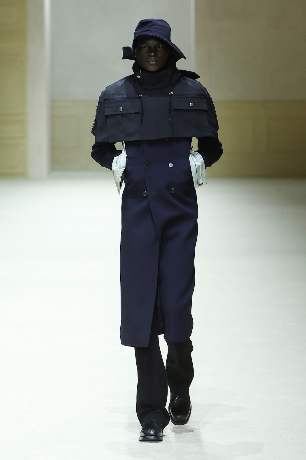 Οι δανεικές ιδέες από τον κόσμο της άθλησης στα χέρια του Πιτσιόλι αφομοιώνονται και γίνονται κομψά σχέδια μόδας: άνετα μοκασίνια με σχεδιαστικές προδιαγραφές αθλητικών, μπουφάν-κάπες ή ένα κίτρινο δερμάτινο τζάκετ με cocoon πλάτη, καλυμμένο με υλικό που το κάνει αδιάβροχο, βραδινά φορέματα που κόβονται όχι από μεταξωτό σιφόν αλλά από ελαστικό ζέρσεϊ, τυλιγμένο και πλισαρισμένο γύρω από το σώμα, με ουρά που μπορεί να σύρεται μεγαλοπρεπώς ή να μαζεύεται για πιο street αποτέλεσμα, ή ένα λευκό στρογγυλεμένο peacoat με υπερμεγέθη στρογγυλά κουμπιά, φορεμένο με κολάν και αθλητικά. Τα παντελόνια παραμένουν oversized, ενώ τα logos εμφανίζονται πιο συμμαζεμένα, με μια συνεργασία με το NBA να διαδέχεται αυτήν με την Puma.