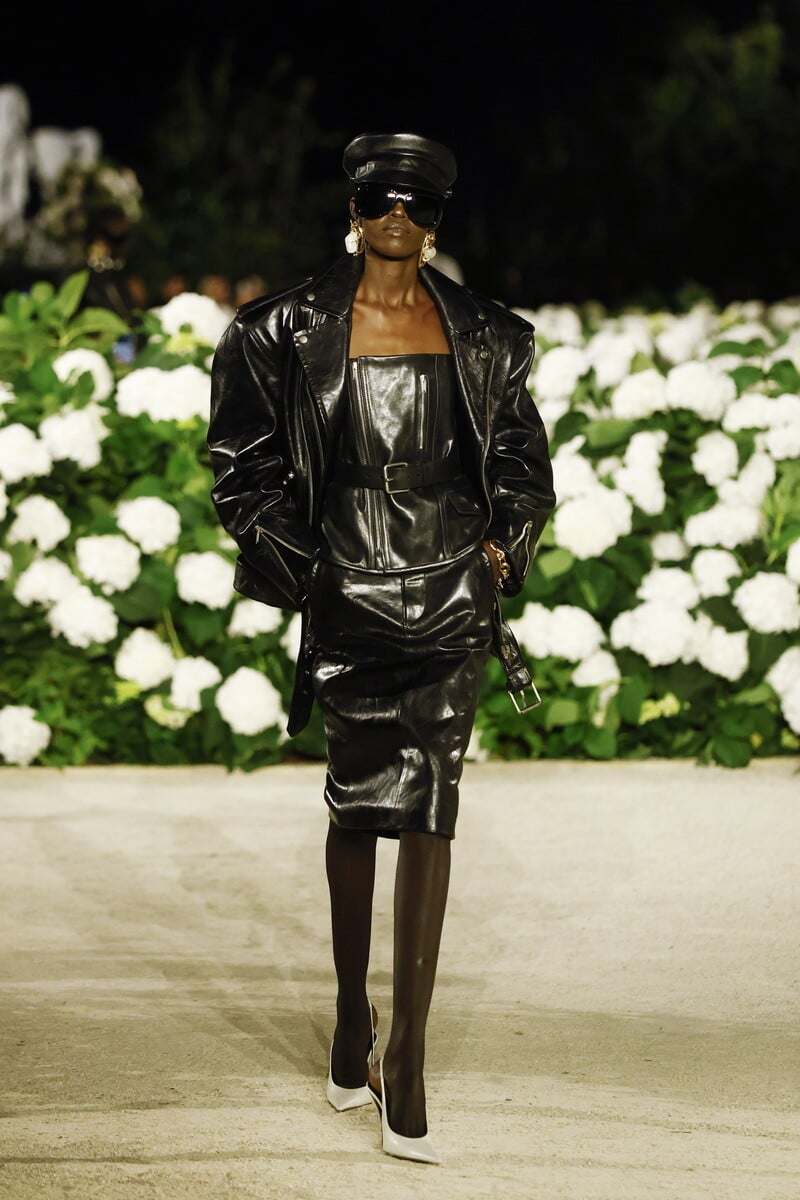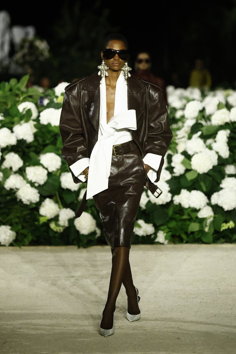 Αυτή η «παρακαταθήκη» του Saint Laurent, ένα κράμα αστικής γοητείας, ερωτισμού και ηθικής χαλαρότητας, που βρέθηκε στο απόγειό της στα '70s και '80s, ξεδιπλώθηκε αριστοτεχνικά σε αυτό το ανοιξιάτικο σόου: θηλυκοί Mapplethorpe με δερμάτινα biker τζάκετ, pencil φούστες και μπλούζες με φουσκωτά μανίκια και φιόγκους («ήθελα να ανοίξω με το ψωνιστήρι των γκέι στους κήπους του Κεραμεικού, και να το μεταφέρω στο σικ Τροκαντερό») περπάτησαν ανάμεσα στις λευκές ορτανσίες του set μαζί με τυπικές φιγούρες Γαλλίδας, με τη διαφορά ότι η κλασική καμπαρντίνα είχε αντικατασταθεί από λεπτά αδιάβροχα που κολλούσαν πάνω σε ημίγυμνα σώματα.