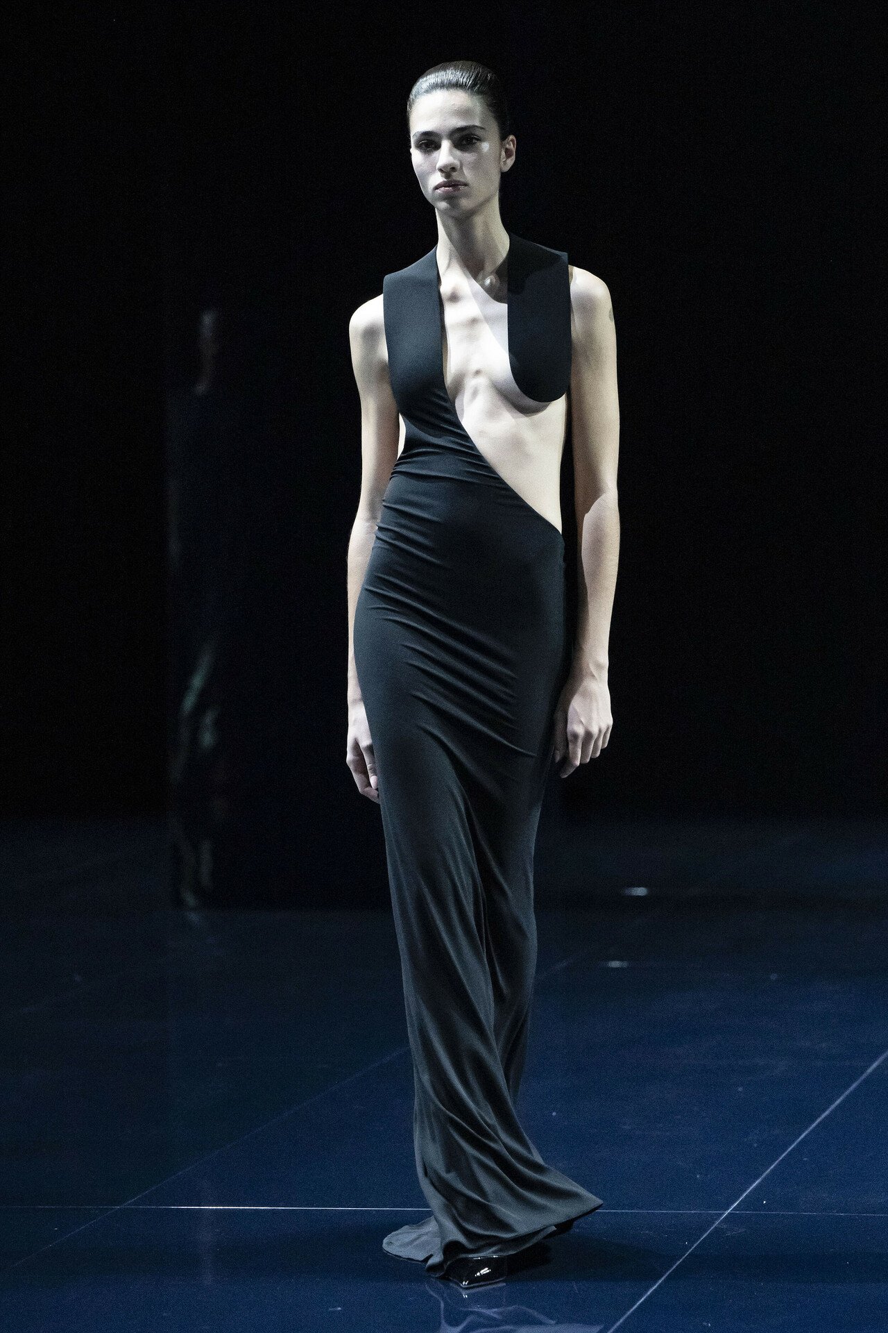 Κάθε κομμάτι ήταν δουλεμένο εξαντλητικά, από το πέτσινο μαύρο perfecto και τα παντελόνια μοτοσικλετιστή ως τα αριστοτεχνικά βραδινά looks που αψηφούσαν τη βαρύτητα, όπως ένα ασύμμετρο μακρύ φόρεμα με μια λωρίδα υφάσματος που περνούσε πάνω από τους ώμους για να καλύψει το αντίθετο στήθος ή ένα μπλε που αγκάλιαζε τη σιλουέτα στηριγμένο σε στρογγυλούς ώμους με βάτες, χωρίς πλάτη.