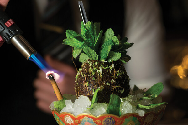 Τρυπάμε τη φρέσκια καρύδα και αφαιρούμε το γάλα της. Σε ένα σέικερ προσθέτουμε πάγο, το ρούμι, το γάλα καρύδας, τον χυμό mango και lime και το μέλι. Χτυπάμε και σουρώνουμε το μείγμα μέσα στην καρύδα. Προσθέτουμε τριμμένο πάγο και 2 σταγόνες bitter. Γαρνίρουμε με φρέσκο δυόσμο, ανάβουμε ένα ξυλάκι κανέλα που είναι τοποθετημένο στο καπάκι της καρύδας και ξύνουμε φρέσκο lime πάνω από το κοκτέιλ..