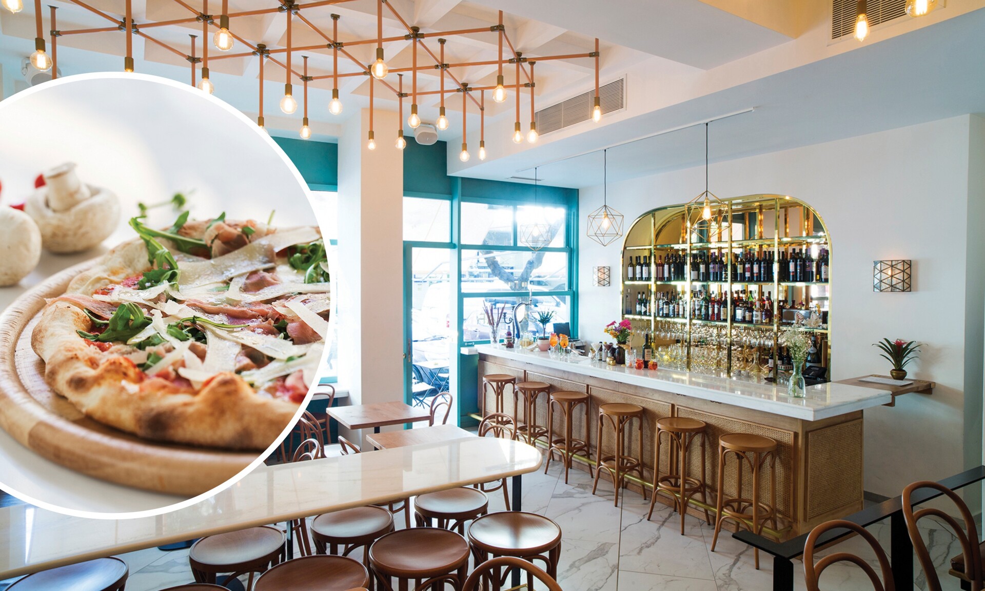 Πίτσα και κοκτέιλ σε ένα φρέσκο, φωτεινό και ευαίσθητο περιβάλλον