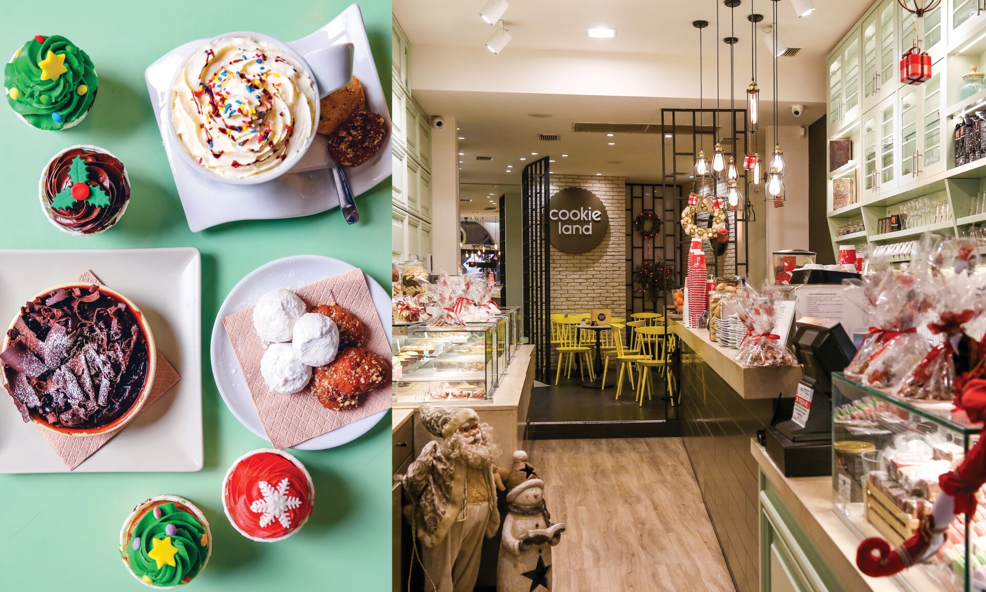 Η χειροποίητη βελγική βάφλα, τα υπέροχα γλυκά και τα περίφημα μπισκότα του Cookieland συμπληρώνονται με εποχικές δημιουργίες που δεν πρέπει να χάσετε, όπως οι κλασικοί κουραμπιέδες και τα λαχταριστά μελομακάρονα παραγωγής Cookieland, ενώ στο μενού προστίθεται και η πεντανόστιμη βασιλόπιτα που θυμίζει παραδοσιακή συνταγή της γιαγιάς. Και επειδή εδώ η φαντασία είναι βασικό συστατικό της κάθε δημιουργίας, αυτές τις μέρες θα βρείτε τα γιορτινά μπισκοτόσπιτα, τους πρωτοχρονιάτικους κορμούς σοκολάτας γαλλικής ζαχαροπλαστικής και τα σοκολατένια χριστουγεννιάτικα δεντράκια που θα σας εντυπωσιάσουν.