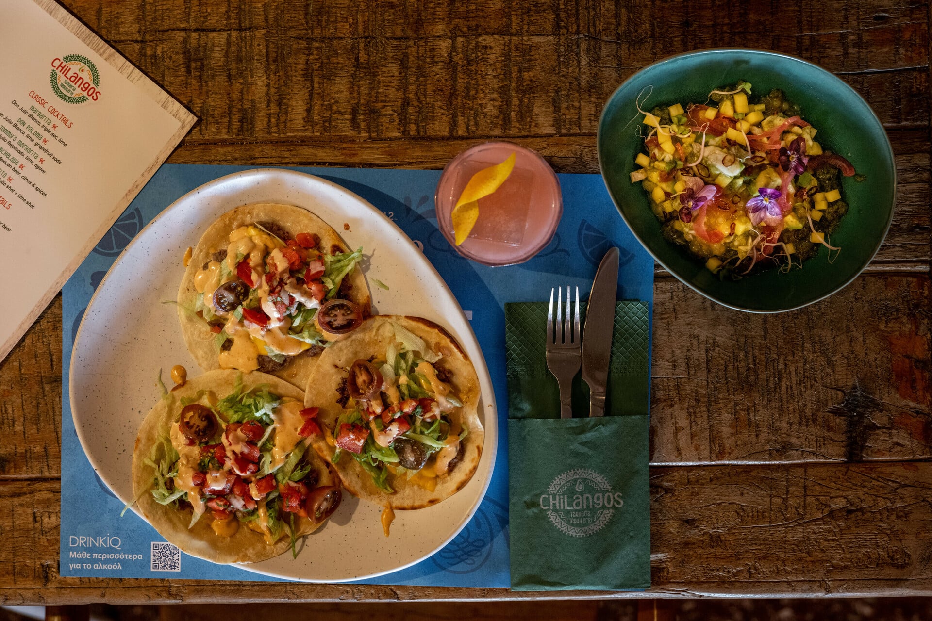 Τάκος, φαχίτας, εντσιλάδας, μπουρίτος, όλες οι αγαπημένες γεύσεις της cocina mexicana παρουσιάζονται σε αυθεντικές συνταγές και συνοδεύονται από άφθονη τεκίλα που προσφέρει η πιο ενημερωμένη tequileria της πόλης.