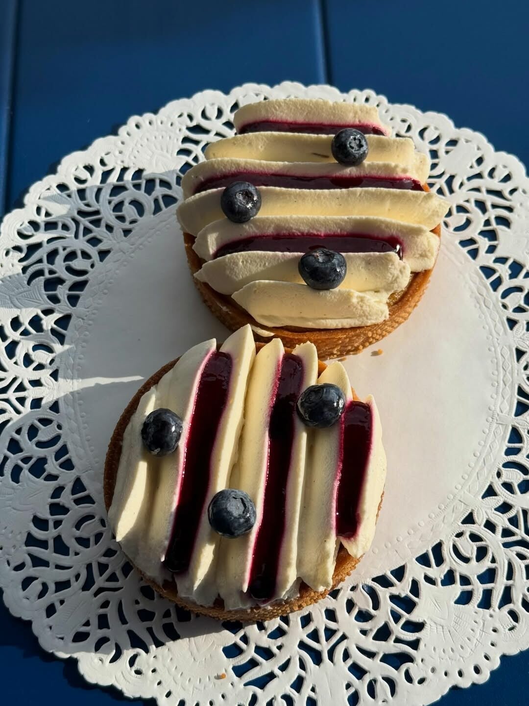 Μια γαλλική boutique patisserie με χειροποίητα γλυκά στη Φιλοθέη. Η τάρτα τους συνδυάζει τραγανή βάση αμυγδάλου, κρέμα πατισερί, μαρμελάδα και coulis μύρτιλο· ολοκληρώνεται με φρέσκα μύρτιλα.