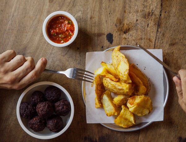 Κατεβαίνοντας τη σκάλα, στον μεσαίο όροφο, μπαίνεις «σαν στο σπίτι σου». Ανοιχτή η μπαλκονόπορτα στην κίνηση, να μπάζει τη δροσιά κι εκείνη τη χαρακτηριστική μυρωδιά της πόλης με καλό καιρό. Το εστιατόριο, pop-up, με ένα καινούργιο Taverna concept που μετρά μία εβδομάδα στις κουζίνες.