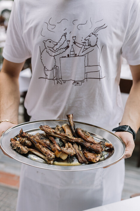 Το φαγητό του είναι πράγματι απλό, γνώριμο, απόλυτα comfort. Mε τα αρνίσια παϊδάκια και αυτά από πρόβατο και κοτόπουλο να πρωταγωνιστούν, όλα τα γύρω γύρω είναι αυτά που καταναλώνουμε στις ταβέρνες-στέκια μας, δοσμένα στην καλύτερη εκδοχή τους. Βάζει το ψωμί στα κάρβουνα με λάδι και ρίγανη, έχει άγρια χόρτα εποχής, αμπελοφάσουλα με ασπρομύτικα φασόλια, ντομάτα ροδέλα στα ζουμιά της με κρίταμο και ελιά τσακιστή για σαλάτα. Η τυροκαυτερή του είναι δυνατή, τα αρνίσια νεφράκια με θρούμπι είναι μεζές που πρέπει να ζήτησετε, όπως και το συκώτι του σε ξίδι ντομάτας και ελαιόλαδο.