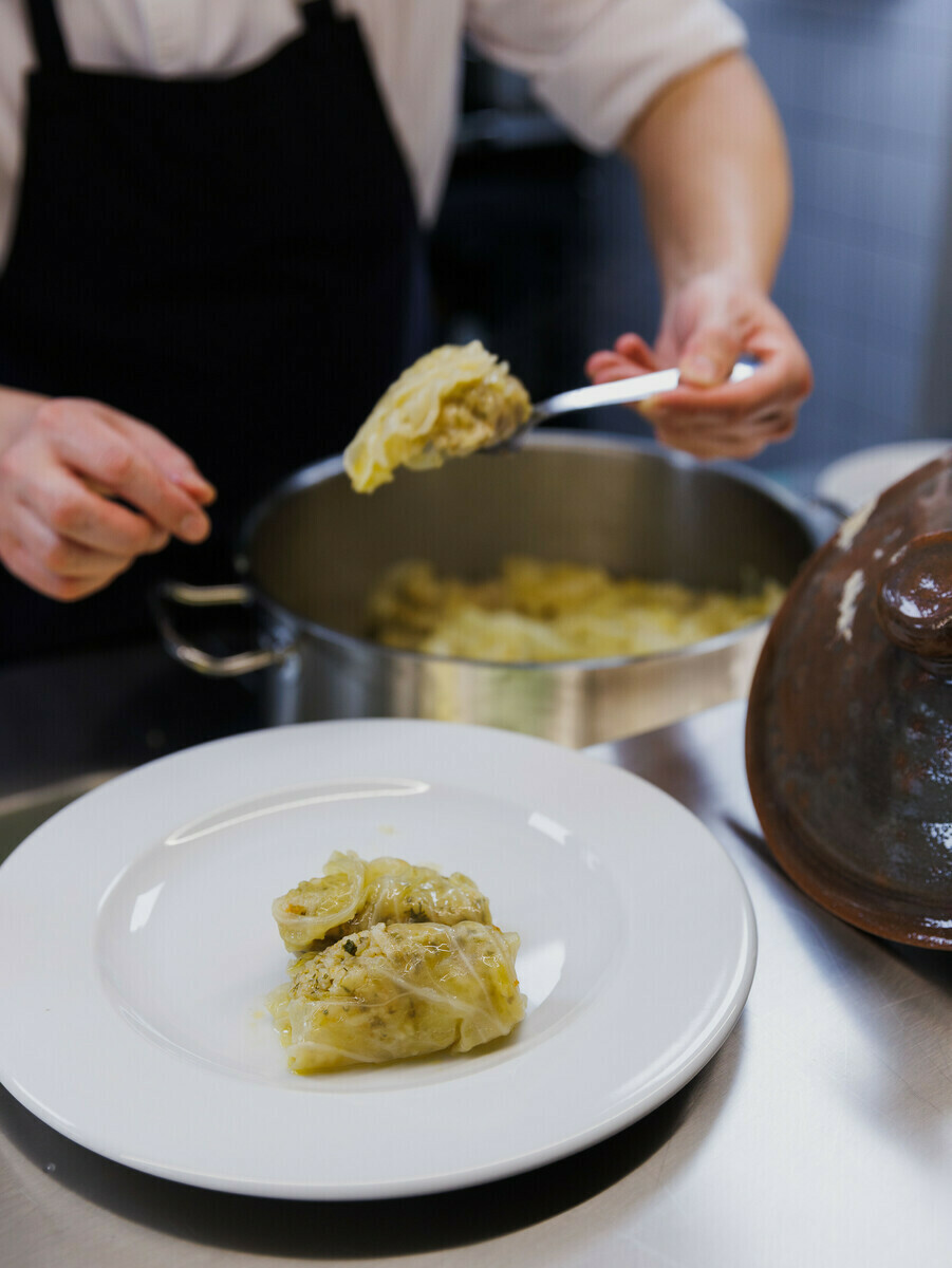 Νησιώτικο αέρα έχουν όμως και τα αγαπημένα φαγητά της Αργυρώς Κουτσού που συναντάμε στην κουζίνα του Koutsou & co (Ξενοφώντος 15Α) στο κέντρο της Αθήνας. Αυτή την περίοδο σερβίρει μια σαλάτα με μπρόκολο και κουνουπίδι επίτηδες παραβρασμένα, φέτα και λαδολέμονο. «Η σαλάτα σερβίρεται ζεστή και τα έχει όλα “τραβηγμένα”, και το λάδι και το αλάτι και το λεμόνι και η φέτα. Και τα λαχανικά είναι παραβρασμένα επίτηδες, έτσι ώστε να γίνονται όλα μια μπουκιά και κάθε πιρουνιά να έχει από όλα. Στο τέλος προσθέτουμε χοντρό αλάτι και πιπέρι». Αλλά και οι λαχανοντολμάδες της με ψιλοκομμένη χοιρινή σπάλα, καπνιστή πάπρικα Αριδέας, κύμινο και τζιώτικο θρούμπι γνωρίζουν ιδιαίτερες δόξες. «Τους κάνουμε με πολύ λίγο ρύζι και μπόλικο κρεμμύδι τσιγαρισμένο καλά. Επίσης, ξεκινούν στην κατσαρόλα και τελειώνουν στον φούρνο. Αυτό το έμαθα από τη Μόνικα που είχα βοηθό στην κουζίνα στη Ζάκυνθο, η οποία είναι από τη Ρουμανία – εκεί φτιάχνουν το sarmale, που είναι κάτι αντίστοιχο. Εμείς τους σερβίρουμε με γιαούρτι στραγγιστό μέσα στο οποίο έχουμε λιώσει και ανακατέψει τα φύλλα του λάχανου που είναι στον πάτο της κατσαρόλας», μου λέει.