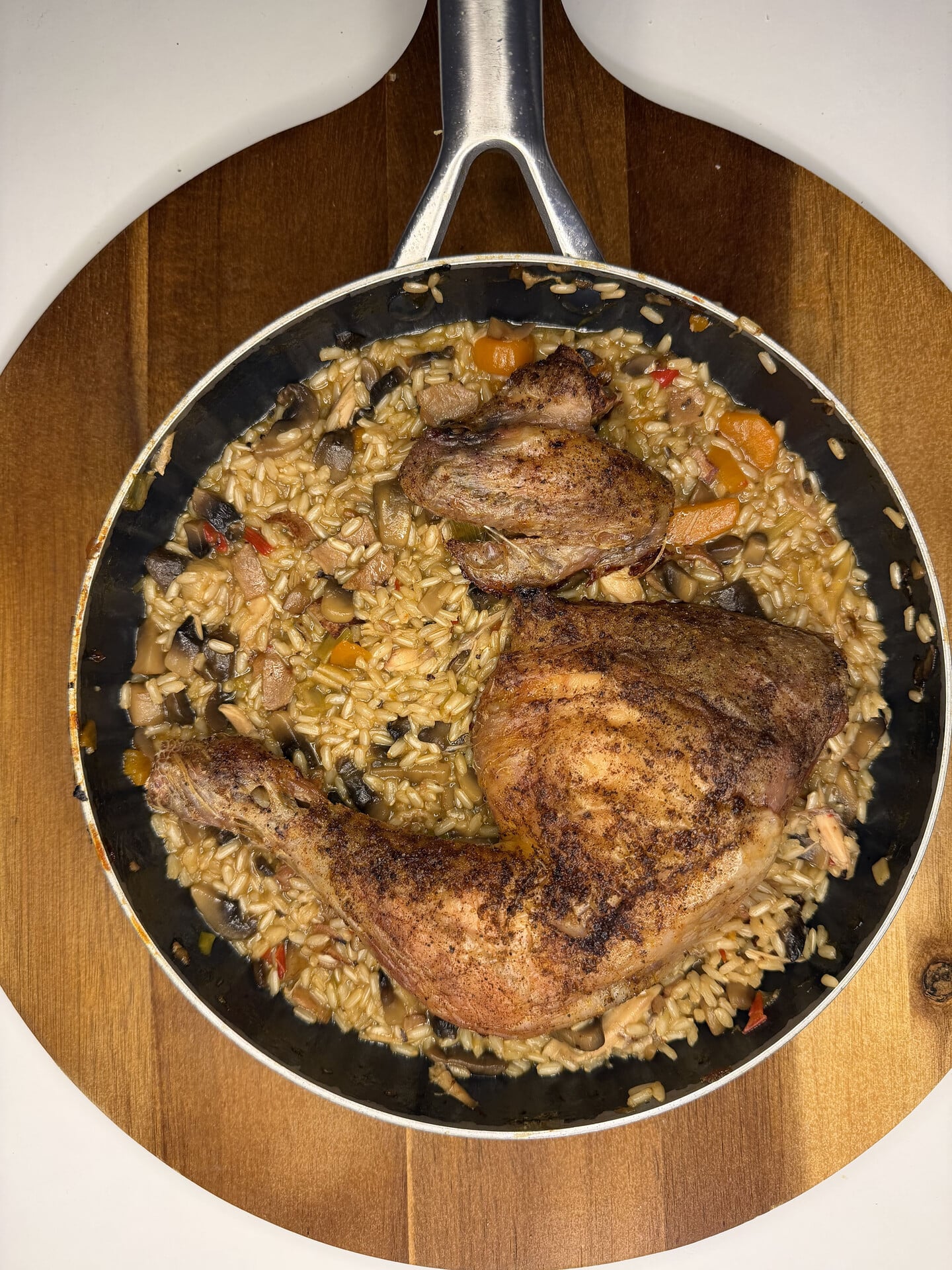 Νομίζω ότι με αυτά τα δύο τηγάνια άλλαξε η τύχη μου. Έφτιαξα ένα εξαιρετικό μπούτι κοτόπουλο με ρύζι και χυλοπιτάκι με κοτόπουλο. Το δεύτερο πιάτο το έκανα όλο στο σχαροτήγανο. Έβαλα πρώτα το κοτόπουλο, μετά τα λαχανικά και αφού τσιγαρίστηκαν, έριξα πελτέ, μετά ροζέ κρασί που περίσσεψε από το Saltimbocca και στη συνέχεια λίγο ζωμό κοτόπουλο που είχα από τις φτερούγες. Αφού τα έκανα όλα αυτά, έριξα τις χυλοπίτες, και στο τέλος mix παρμεζάνα - πεκορίνο για να δέσει. Απίστευτη γεύση.