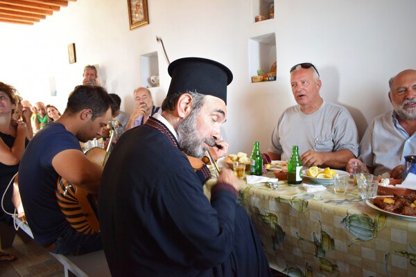 Ο παπα-Στρατής πιάνει το βιολί. Τραγουδά ο παπα-Γιάννης. Μια μουσική υποχθόνια από τα βάθη των πολιτισμών που πέρασαν πάνω απ' αυτό το νησί. Όλοι μαζί βάζουν τις νότες, τα λόγια τους. Καημός και χαρά.