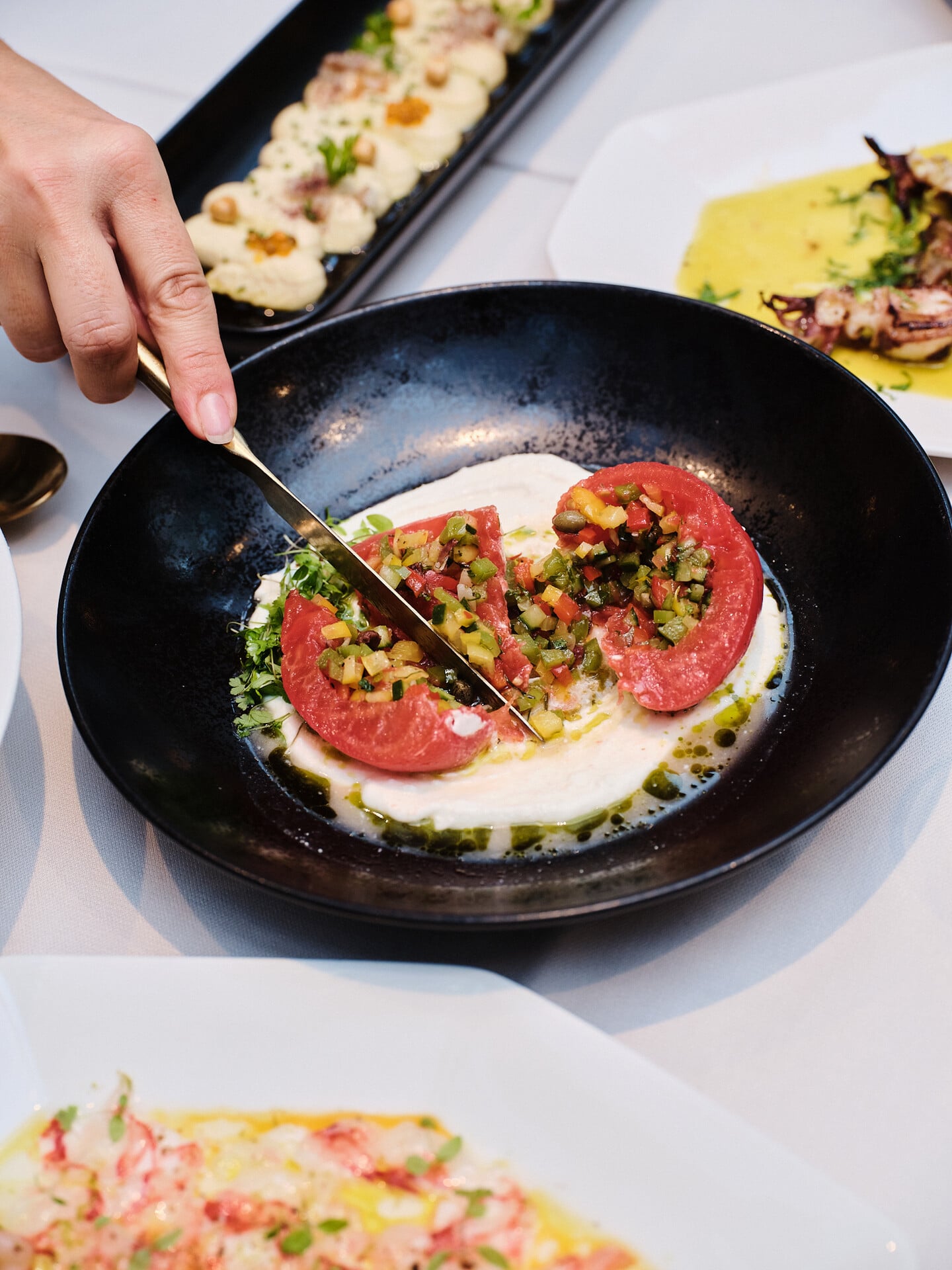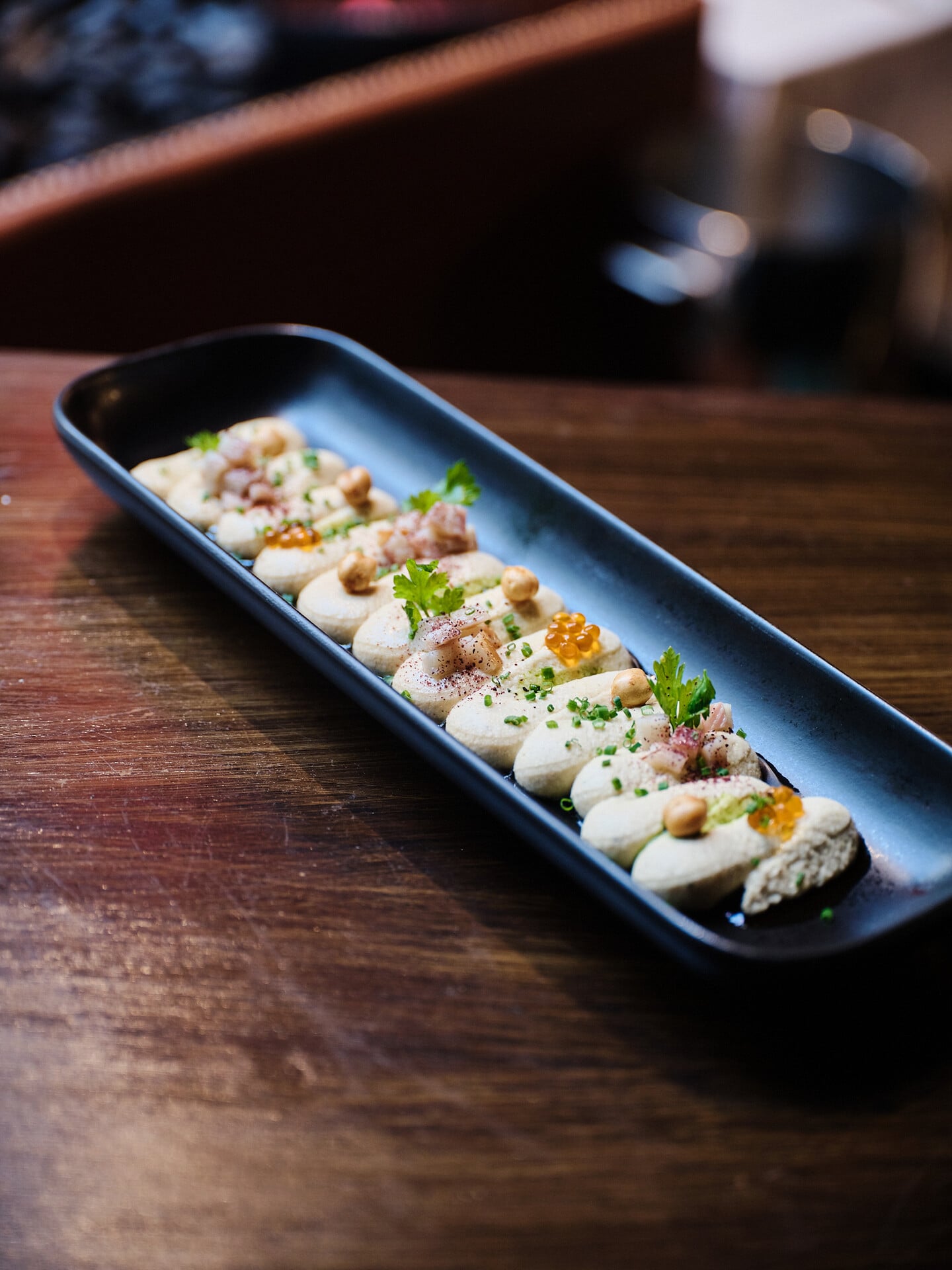 Το γεύμα ξεκινά με ταραμοσαλάτα (€9), γαρνιρισμένη με πούδρα αυγοτάραχου. Κάθε μπουκιά πάνω στο ζεστό ζυμωτό ψωμί 24ωρης ωρίμανσης γίνεται επικίνδυνα εθιστική. Εξίσου νόστιμο είναι και το χούμους, που εδώ συνδυάζεται με καπνιστό χέλι Μεσολογγίου – τα τραγανά ρεβίθια που καταλαβαίνεις σε κάθε πιρουνιά δίνουν την υφή που χρειάζεται. Αλοιφές καλοφτιαγμένες, για δυνατό ξεκίνημα, προτού πάρουν τη σκυτάλη τα μαριναρισμένα και τα ωμά.