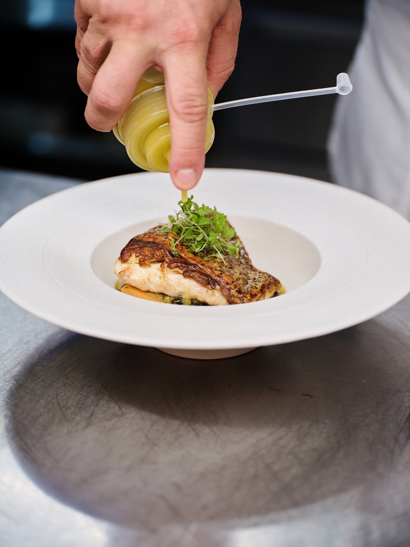 Στην κουζίνα βρίσκεται ο σεφ Δημήτρης Νίκολης, Χαλκιδαίος στην καταγωγή και θαλασσινός στην ψυχή. Γνωρίζει από πρώτο χέρι τη φρέσκια πρώτη ύλη του Ευβοϊκού, όχι θεωρητικά αλλά βιωματικά. Την έχει μυρίσει στα καΐκια, την έχει καθαρίσει, την έχει μαγειρέψει και –το κυριότερο– ξέρει πώς να την αναδείξει. Η εμπειρία του από το εστιατόριο Barbarossa της Πάρου άφησε το μαγειρικό της αποτύπωμα: καθαρές γεύσεις, θαλασσινές εμπνεύσεις, πιάτα με αυτοπεποίθηση.