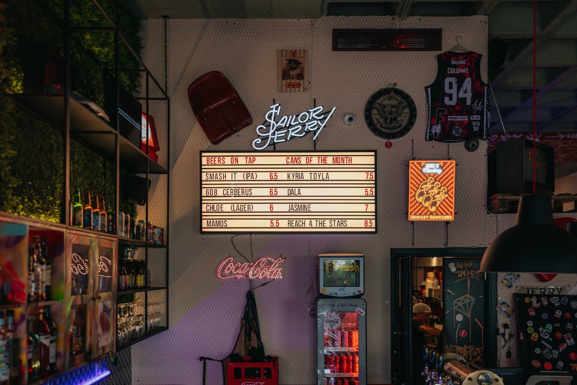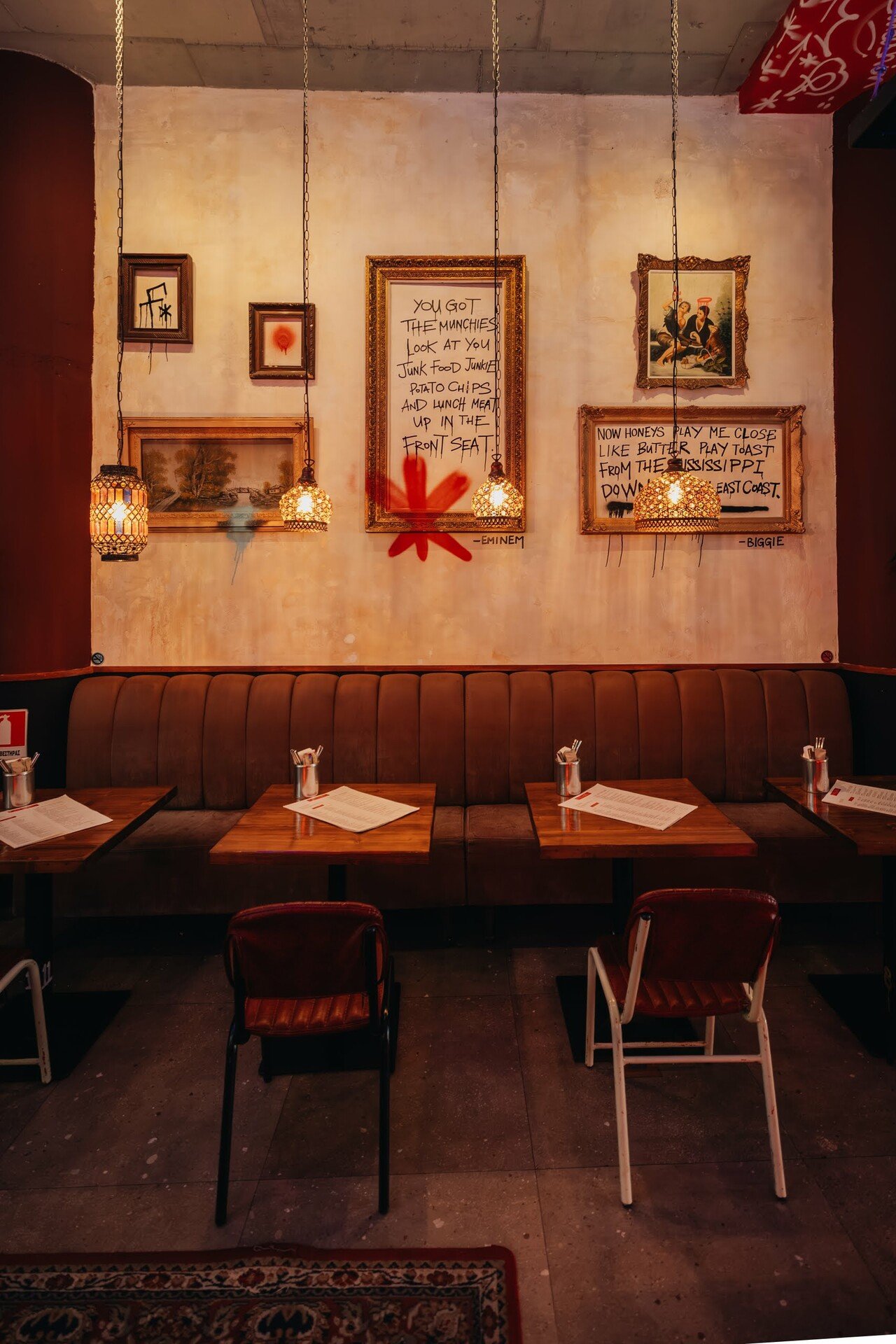 Πράγματι, το πρότζεκτ μεγάλωσε γρήγορα και μέσα σε περίπου ένα χρόνο το F*Smashing είχε πλέον το δικό του σπίτι για να υποδέχεται το κοινό στον Χολαργό. Με δύο εξωτερικούς χώρους και ένα μεγάλο, ψηλοτάβανο «σαλόνι», το μαγαζί συνδυάζει ατμόσφαιρα με το coolness ενός στριτφουντάδικου. Η διακόσμηση είναι προσεγμένη στη λεπτομέρεια, με ετερόκλητα στοιχεία και γωνιές με easter eggs: βελούδινοι καναπέδες και καρέκλες, χρυσές κορνίζες με quotes και γκράφιτι στους τοίχους, παλιές αμερικάνικες πινακίδες και νέον φώτα, μια ρετρό κονσόλα παιχνιδιών, ένας vintage πίνακας με το μενού αλλά και ένα merch corner δημιουργούν ένα μικρό σύμπαν που γίνεται ιδανικό σκηνικό για χαλαρή βραδινή έξοδο αλλά και μεσημεριανό άραγμα με φίλους.