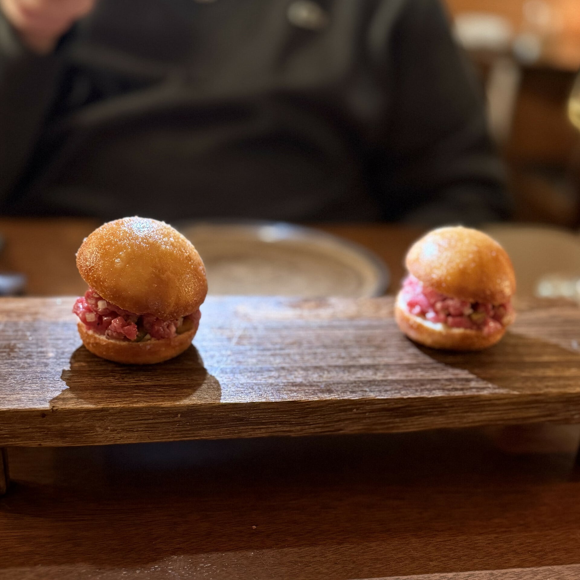 Το μπέργκερ με το ταρτάρ του είναι μια πραγματικά ξεχωριστή λιχουδιά. Βασικά, το ψωμάκι δεν είναι μπέργκερ αλλά θυμίζει πιροσκί.