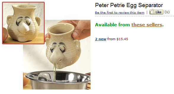 Προλάβετε, όσο υπάρχει ακόμα: ο διαχωριστής αβγών κάνει αυτή την κατά τα άλλα εύκολη δουλειά 100% αηδιαστική. Η μύτη κρατάει τον κρόκο ενώ τα ρουθούνια αναλαμβάνουν τη δύσκολη διαδικασία. Τουλάχιστον δεν είναι από πλαστικό.