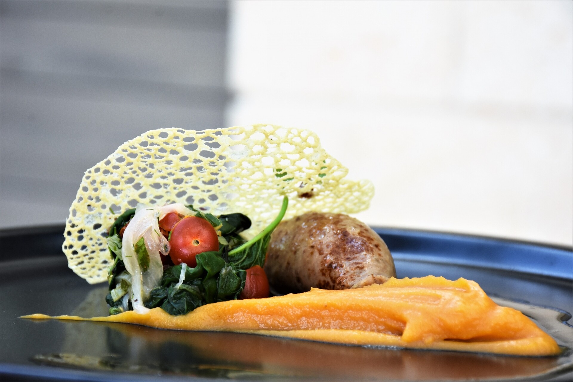 Χειροποίητο λουκάνικο με σιγομαγειρεμένο κατσικάκι braisé, άγρια τσιγαριαστά χόρτα, πουρέ γλυκοπατάτας Νάξου και σάλτσα κρασιού