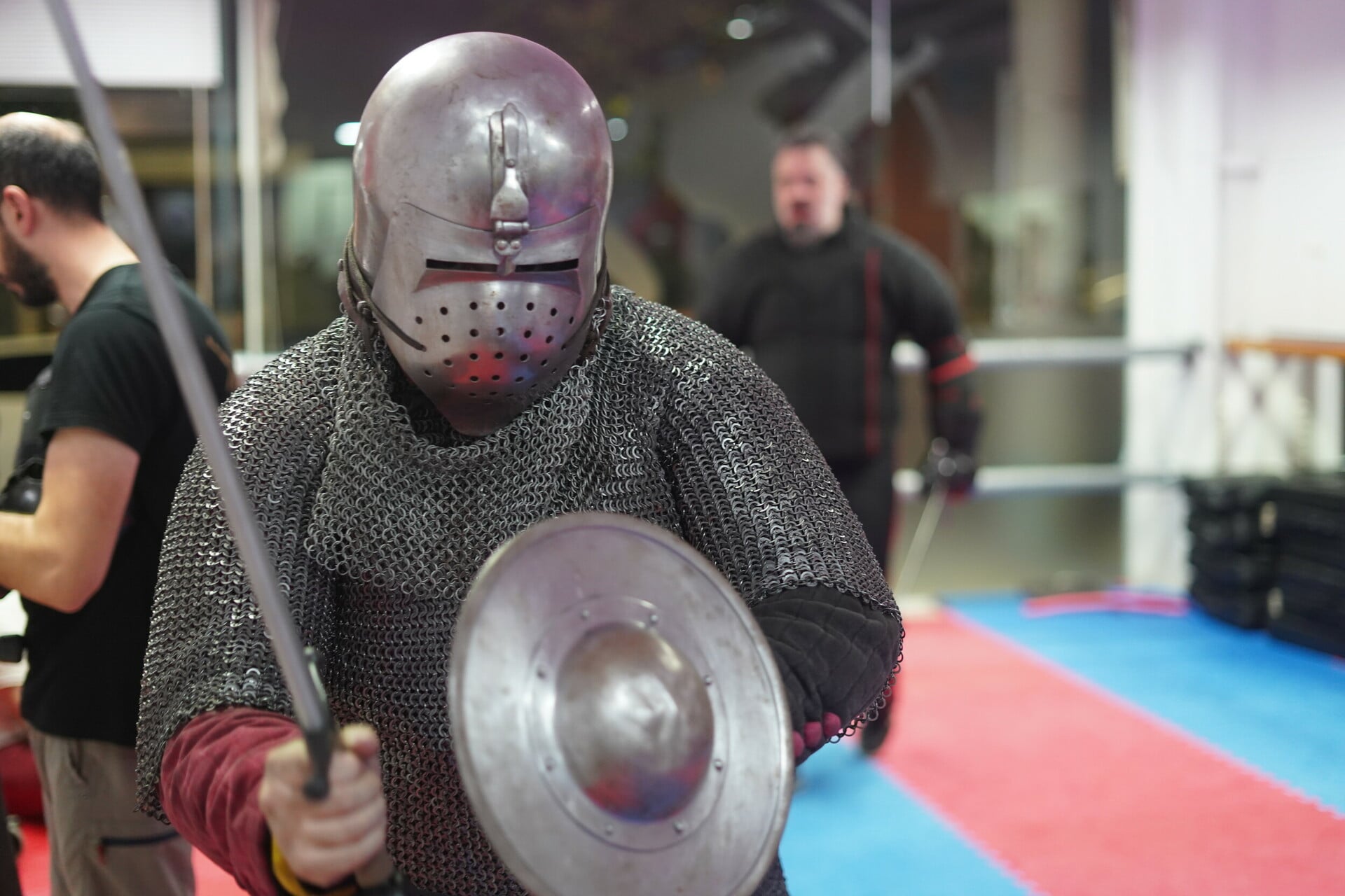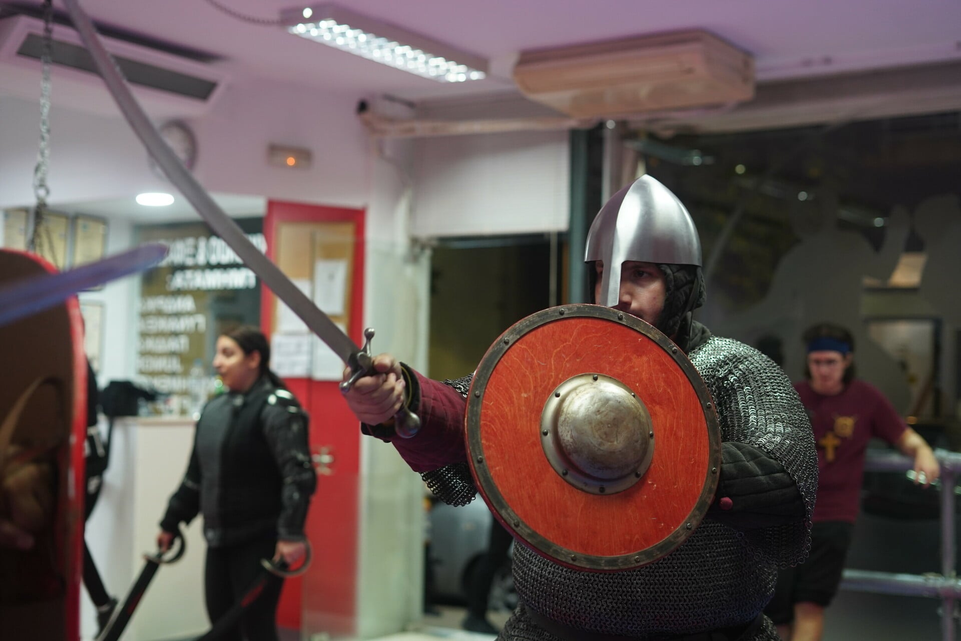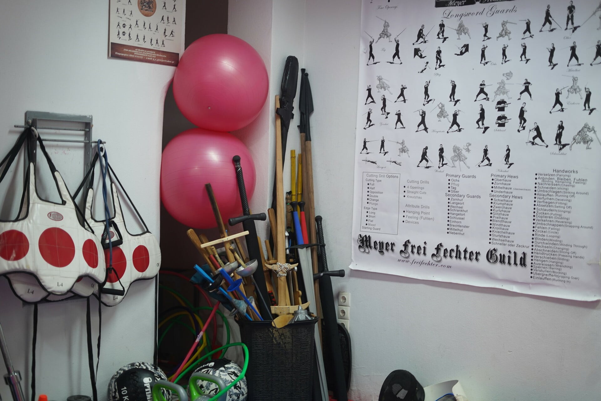 Περιηγούμαι για λίγο στον χώρο. Οι περισσότεροι μαθητές διασταυρώνουν τα εκπαιδευτικά τους ξίφη (συνασκήσεις), ενώ οι υπόλοιποι δοκιμάζουν τις πανοπλίες τους. Μπορεί οι εγκαταστάσεις να είναι σύγχρονες, όμως η ατμόσφαιρα έχει πράγματι κάτι το μεσαιωνικό. Στο βάθος της αίθουσας ξεχωρίζει μια θήκη φορτωμένη με κάθε λογής σπαθί, με φόντο μια αφίσα των κινήσεων longsword, του πρωτεργάτη της τέχνης της ξιφασκίας Joachim Meyer.