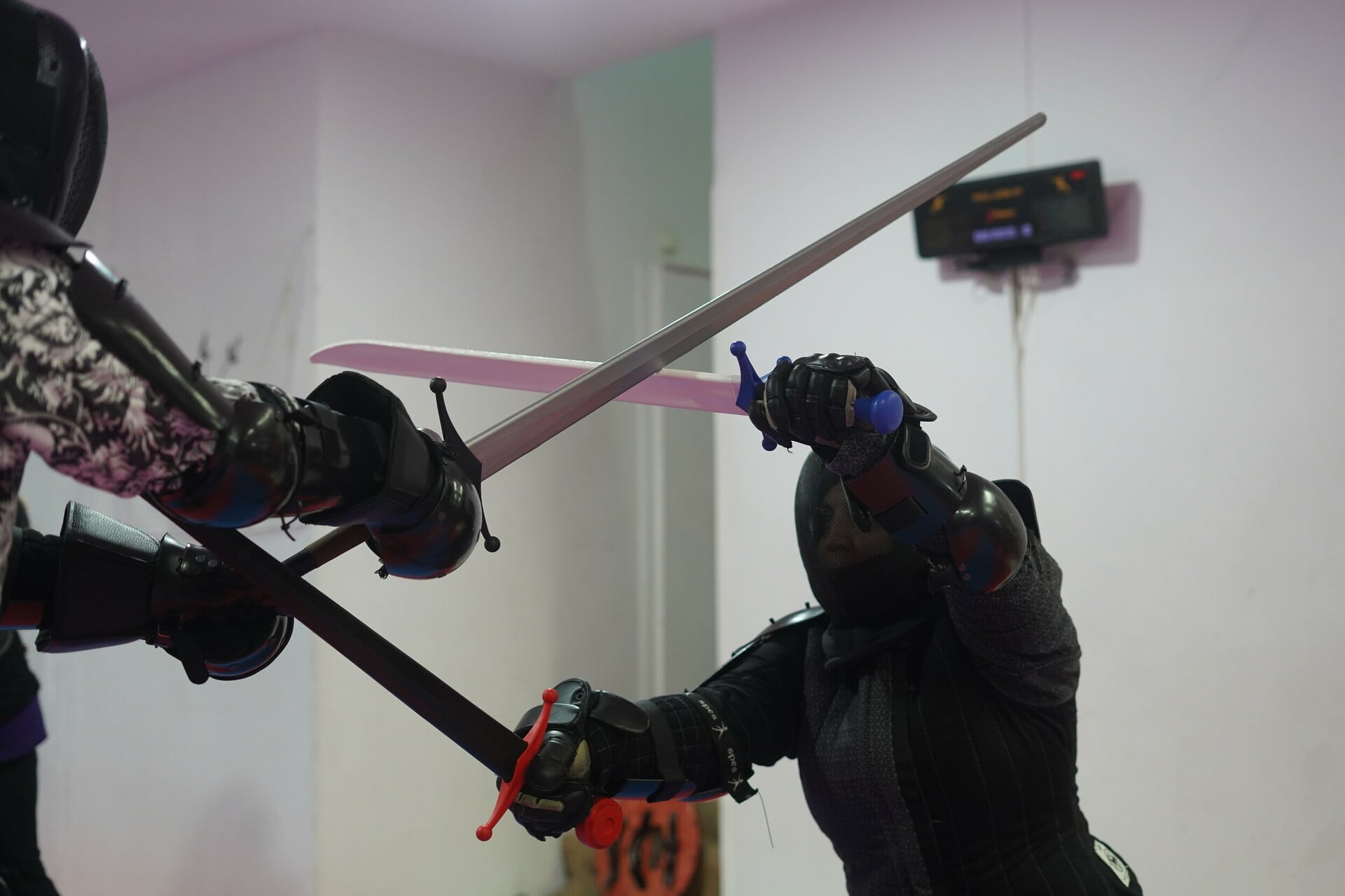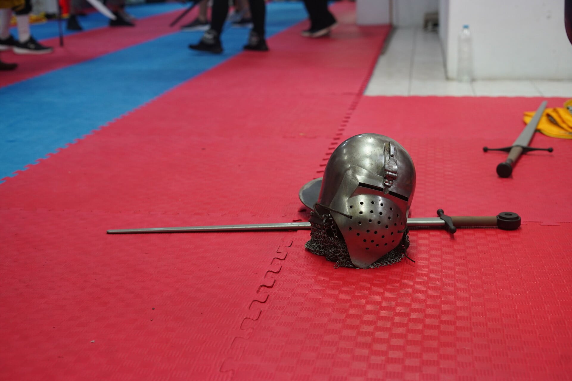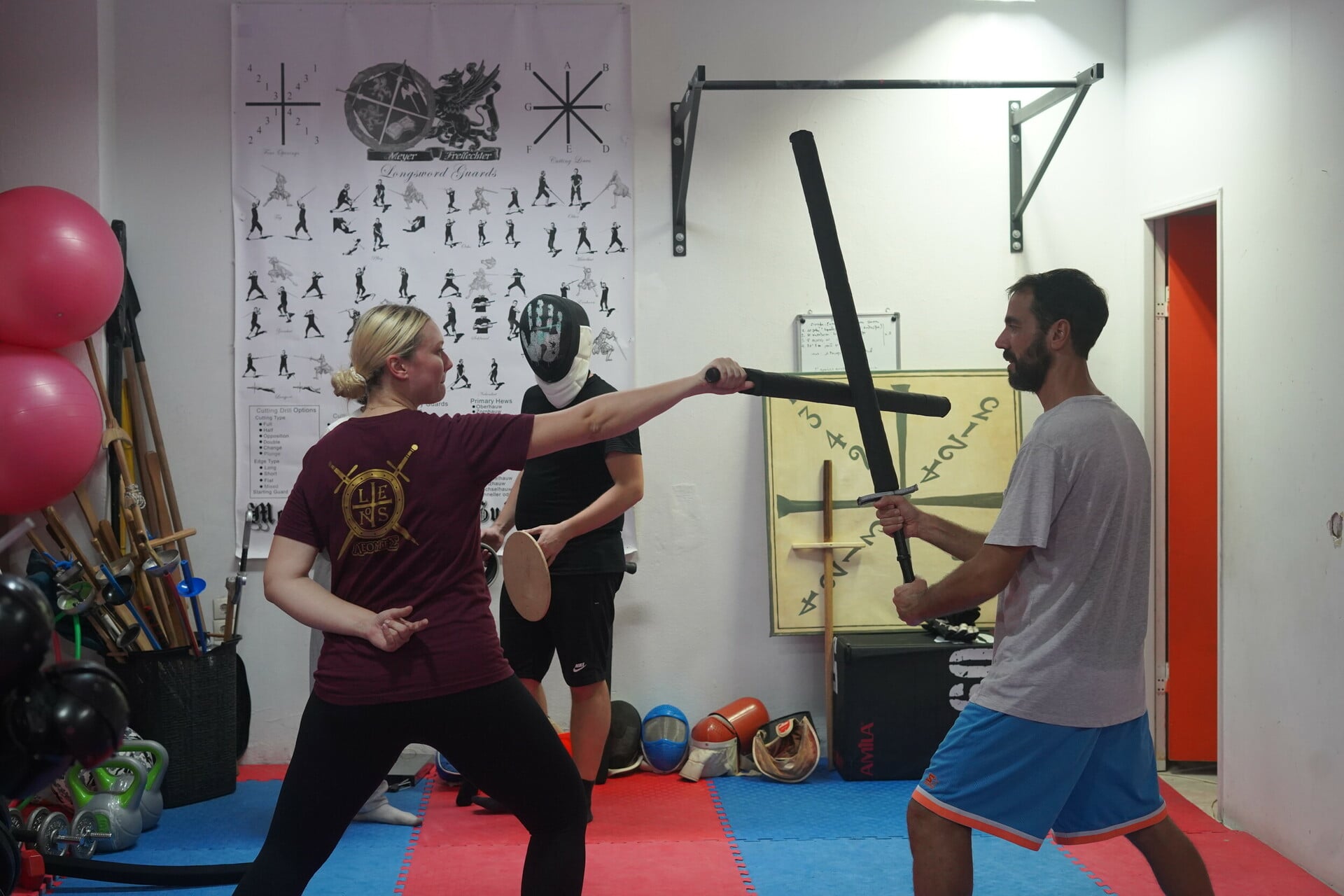 Περιηγούμαι για λίγο στον χώρο. Οι περισσότεροι μαθητές διασταυρώνουν τα εκπαιδευτικά τους ξίφη (συνασκήσεις), ενώ οι υπόλοιποι δοκιμάζουν τις πανοπλίες τους. Μπορεί οι εγκαταστάσεις να είναι σύγχρονες, όμως η ατμόσφαιρα έχει πράγματι κάτι το μεσαιωνικό. Στο βάθος της αίθουσας ξεχωρίζει μια θήκη φορτωμένη με κάθε λογής σπαθί, με φόντο μια αφίσα των κινήσεων longsword, του πρωτεργάτη της τέχνης της ξιφασκίας Joachim Meyer.