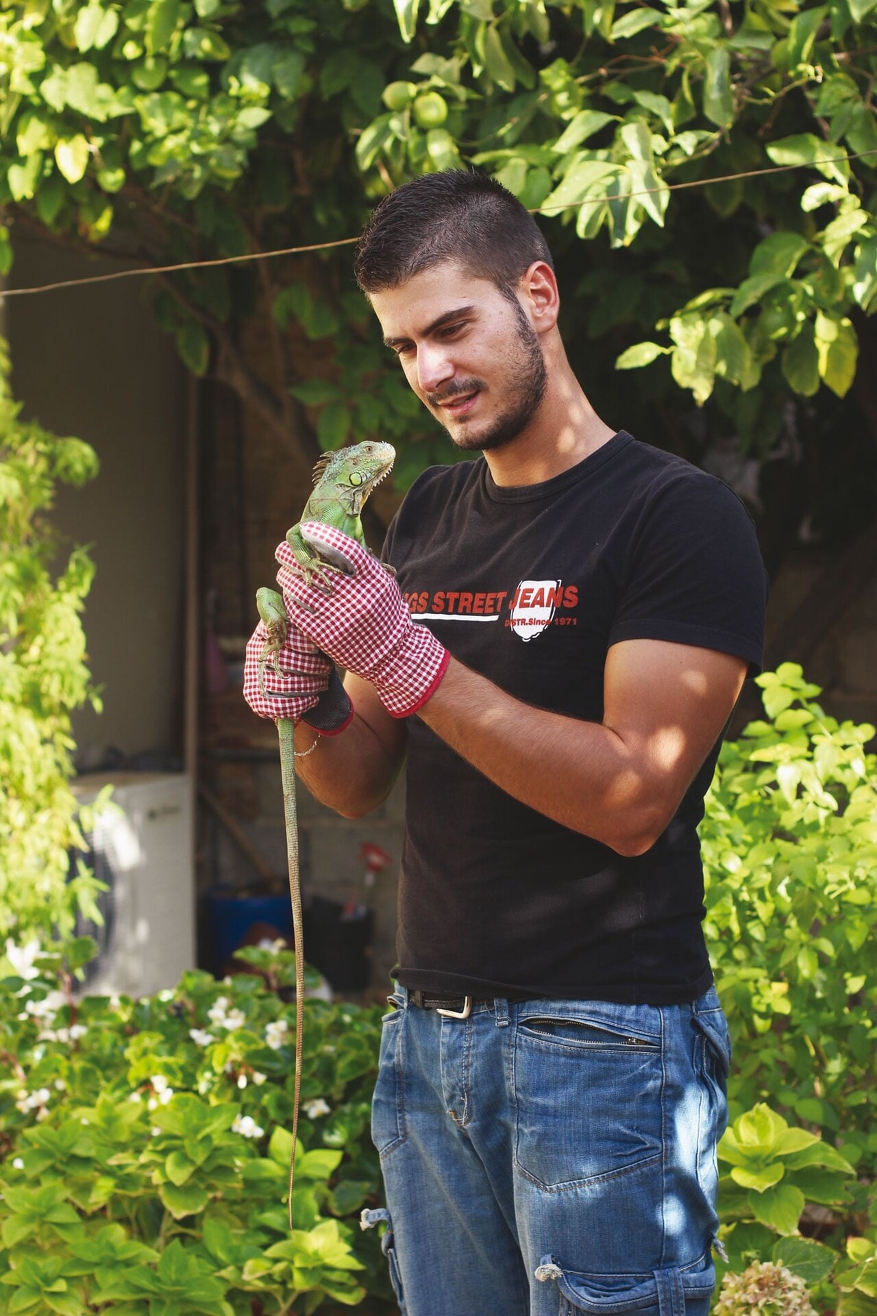 Το ιγκουάνα μου το έχω δύο χρόνια. Είναι νορμάλ χαρακτήρας. Ήσυχο, ήρεμο, λίγο αγχωτικό και του αρέσουν τα χάδια... Δεν υπάρχει κάποιος άνθρωπος που να μην τον συμπαθεί, στρεσάρεται όμως όταν βλέπει πολλούς μαζεμένους. Το πιο αστείο περιστατικό που θυμάμαι από τον Βρασίδα είναι όταν τον κρατούσα στα χέρια μου μια φορά και πετάχτηκε στα κεφάλια του αδερφού μου και της νύφης μου, στον καναπέ του σπιτιού. Η αλήθεια είναι πως όταν τον έχω στα χέρια μου και τον βλέπουν άλλοι άνθρωποι, όλοι έχουν την ίδια αντίδραση: «Πάρ' το από δω! Είναι αηδιαστικός! Παναγία μου!». Όταν, όμως, είναι μέσα στο terrarium, κάθονται και τον χαζεύουν για αρκετή ώρα και τον παρατηρούν, ενώ τους παρατηρεί και αυτός. Αυτό που τον ξετρελαίνει είναι όταν τον ψεκάζω με νερό για να του δημιουργώ υγρασία. Όπως κάθεται πάνω στον κορμό του, με το που νιώσει το νερό να τον ακουμπά, τεντώνει τα μπροστινά του πόδια, κλείνει τα μάτια, σηκώνει το κεφάλι ψηλά και τεντώνει τη μεμβράνη που βρίσκεται στο κάτω μέρος του λαιμού του. Αυτό που απεχθάνεται είναι οι απότομες κινήσεις, γιατί αγριεύει. Το πιο δυνατό χαρακτηριστικό του είναι η ουρά του και τα αγκάθια του. Απ' όταν τον υιοθέτησα έγινα πιο υπεύθυνος, με την έννοια πως στην παρέα με τα κατοικίδιά μου προστέθηκε και αυτός κι έτσι τον έχω περισσότερη έγνοια. Σκέφτομαι καθημερινά πως πρέπει να φροντίσω για την προβλεπόμενη θερμοκρασία του, τις ακτίνες UVB που χρειάζεται ο οργανισμός του, την τροφή του, την υγρασία του και, το σημαντικότερο φυσικά, την καθαριότητά του! Επίσης, με εξιτάρει το γεγονός πως μεγαλώνω έναν απόγονο των δεινοσαύρων και μου αρέσει να παρακολουθώ τον τρόπο που αναπτύσσεται με τον καιρό.