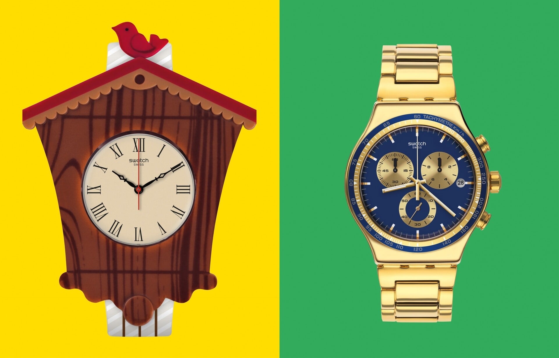 Αριστερά: Tο μοντέλο Uhlry της Swatch είναι ένα εντυπωσιακό γιορτινό γυναικείο ρολόι που προσομοιάζει στα επιτοίχια ρολόγια με τον κούκο που βρίσκουμε συνήθως στις χώρες της Κεντρικής Ευρώπης. Δεξιά: Το γυναικείο ρολόι Power Shot από τη Swatch είναι μια δυναμική πρόταση με stainless σε χρυσούς τόνους και όμορφο μπλε καντράν — Swatch, Ερμού 5, Σύνταγμα / Σταδίου 60, Πλατεία Ομονοίας / Πατριάρχου Ιωακείμ 12, Κολωνάκι / Εθνικής Αντιστάσεως 41, Περιστέρι / The Mall of Athens, Ανδρέα Παπανδρέου 35 / Α. Μεταξά, Γλυφάδα.