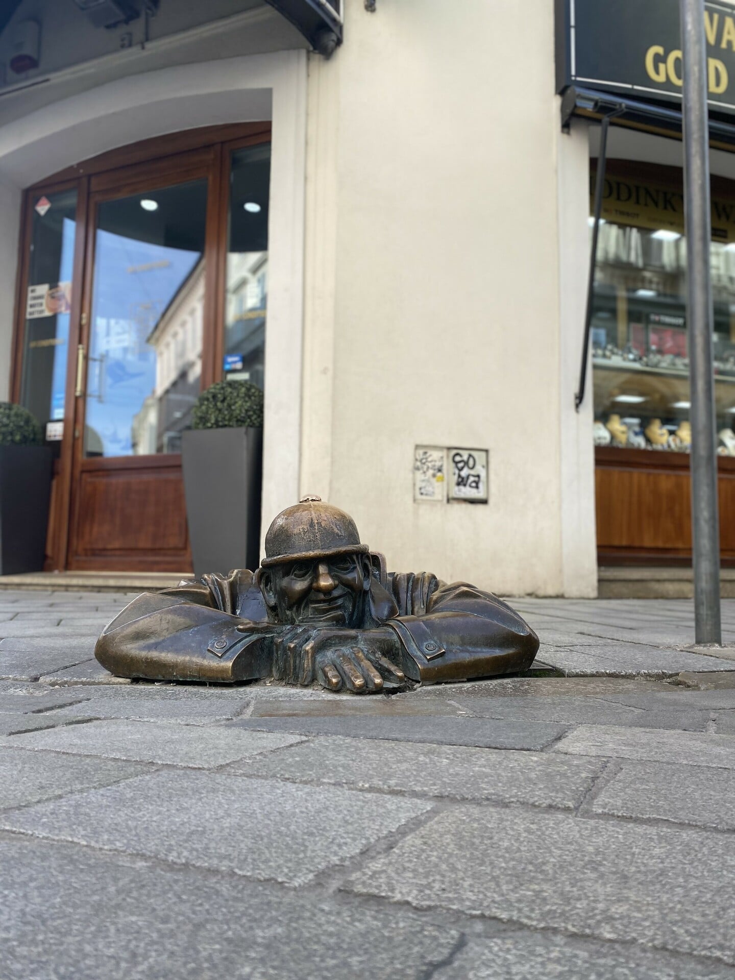 Facebook Twitter Δίπλα στο συντριβάνι του Μαξιμιλιανού, ακριβώς έξω από το Café Mayer (το παλαιότερο καφέ της πόλης), σε περιμένει ο Schöne Náci με το καπέλο του. Πρόκειται για πραγματικό πρόσωπο, που ο μύθος θέλει να τρελάθηκε όταν τον παράτησε η γυναίκα που αγαπούσε και τριγυρνούσε στους δρόμους φορώντας πάντα τα καλά του και χαρίζοντας λουλούδια στις γυναίκες. Λίγο πιο κάτω, στη διασταύρωση των οδών Laurinská και Panská βρίσκεται ο «Man at Work» Cumil, το πρώτο άγαλμα που σου βγάζει το Google αν πατήσεις Μπρατισλάβα, ένας εργάτης χαμογελαστός που ξεπροβάλλει μέσα από έναν υπόνομο.