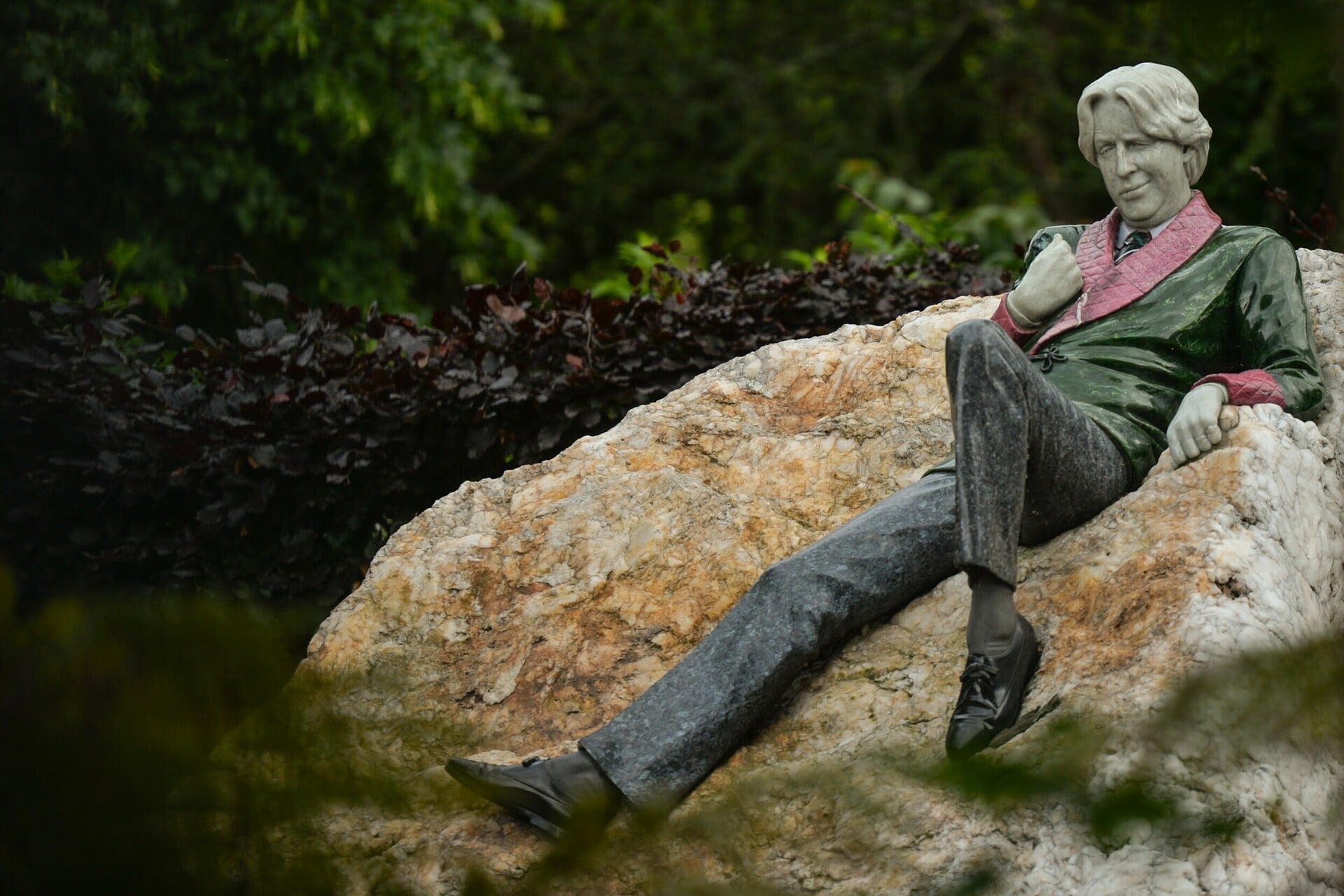 Αν και ο τάφος του στο Κοιμητήριο Περ Λασαίζ είναι ένα από τα κλασικά τουριστικά σποτ του Παρισιού, στο Δουβλίνο βρίσκονται όχι ένα, αλλά δύο life sized αγάλματα του Όσκαρ Γουάιλντ (1854 -1900). Το πρώτο, που αποτελεί και μνημείο, βρίσκεται στην πλατεία Merrion κοντά στο περίφημο Trinity College όπου φοίτησε ο διάσημος συγγραφέας. Σε αυτή την εντυπωσιακή, έγχρωμη εκδοχή, ο γλύπτης Danny Osborne συνδύασε διαφορετικά υλικά για να πλάσει την μορφή του Ουάιλντ που παρακολουθεί νωχελικά την κίνηση της πλατείας ημι-ξαπλωμένη σε έναν μεγάλο βράχο. Απέναντι από το άγαλμα βρίσκονται δύο μικρότερα που «συνομιλούν» μαζί του -η έγκυος γυναίκα του Κόνστανς Λόιντ και μια προτομή του νεαρού θεού Διονύσου. Όμως, μόλις 4 λεπτά μακριά με τα πόδια, υπάρχει και μία ακόμη πιο «γήινη» εκδοχή του Ουάιλντ -ένα μπρούτζινο παγκάκι -γλυπτό με το άγαλμά του καθισμένο έξω από την παμπ Kennedy's Pub & Restaurant, όπου έπιασε την πρώτη του δουλειά σαν έφηβος.