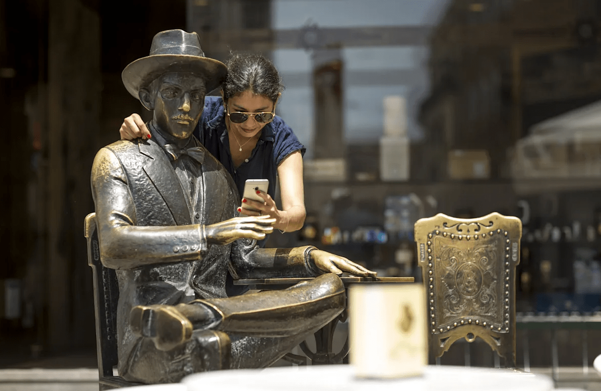 Φτάνοντας έξω από το διάσημο Café A Brasileira στη συνοικία Chiado της Λισαβόνας, βρίσκεις το άγαλμα του Φερνάντο Πεσσόα να κάθεται σε ένα τραπέζι, και να χειρονομεί σαν να βρίσκεται στη μέση μιας συζήτησης.